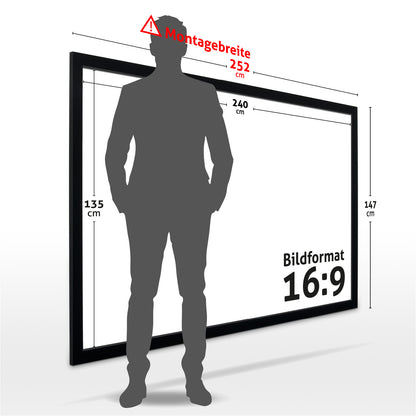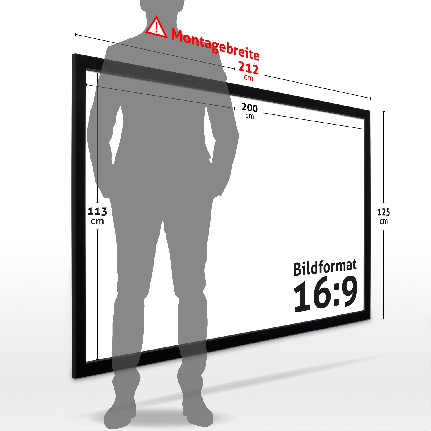 Die 212 cm große Beamer-Leinwand macht Ihr Zuhause zum Heimkino. Hochauflösende Inhalte werden auf der Projektionsfläche im Format 16:9 in hervorragender Bildqualität dargestellt. ESMART Economy Leinwände bieten immer das richtige Format und die ideale Höhe für jeden Ihrer individuellen Projektionswünsche. Für hohen Betrachtungskomfort und ein kontrastreiches Bild sorgt der mattweiße, diffuse Leinwandstoff. Der schwarze Rahmen mit Velours-Bespannung erhöht den Kontrast und entlastet das betrachtende Auge. Da das Leinwandtuch mit LED-, LCD- und DLP-Projektoren kompatibel ist, eignet sich die Rahmenleinwand für Filme und Spiele genauso wie für Präsentationen im professionellen Bereich. Für Ultrakurzdistanz-Beamer ist diese Leinwand aufgrund ihrer absoluten Planlage besonders geeignet.