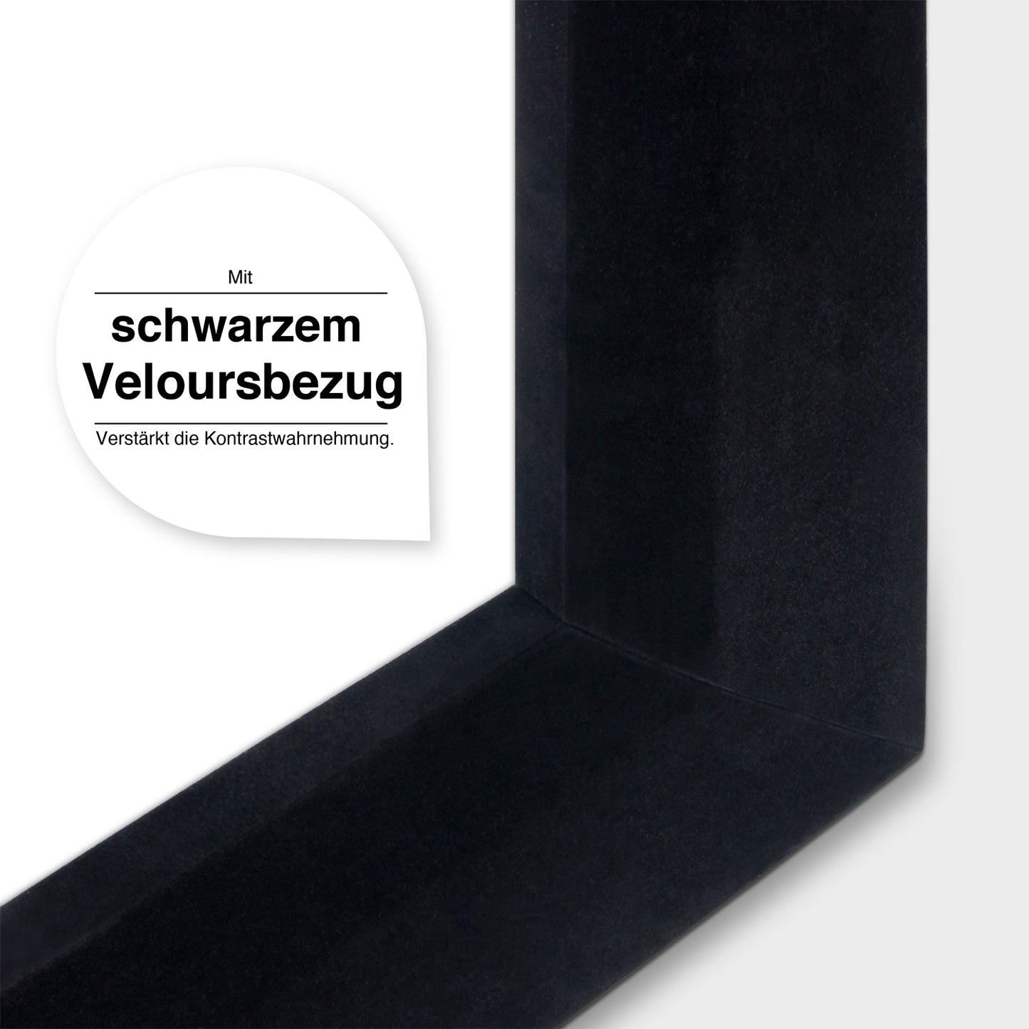 Der schwarze Veloursbezug verstärkt die Kontrastwahrnehmung und entlastet das betrachtende Auge.