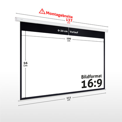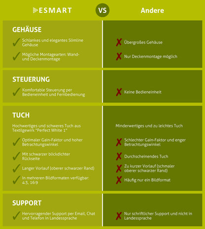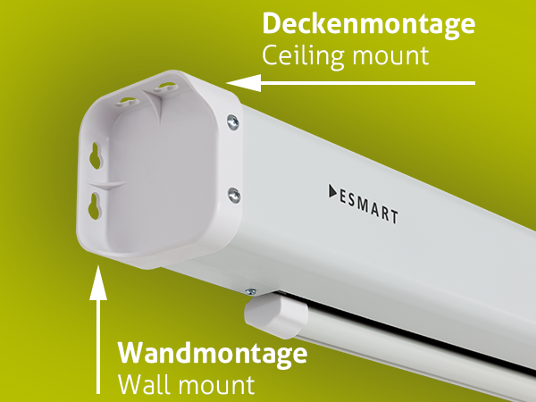 Besonders komfortabel wird die Nutzung der ESMART Motor Leinwand durch den besonders langen schwarzen Vorlauf von bis zu 30 cm. So ist eine Deckenmontage oft ohne das Abhängen des Leinwandgehäuses möglich, ohne dass das Bild später zu hoch ist.