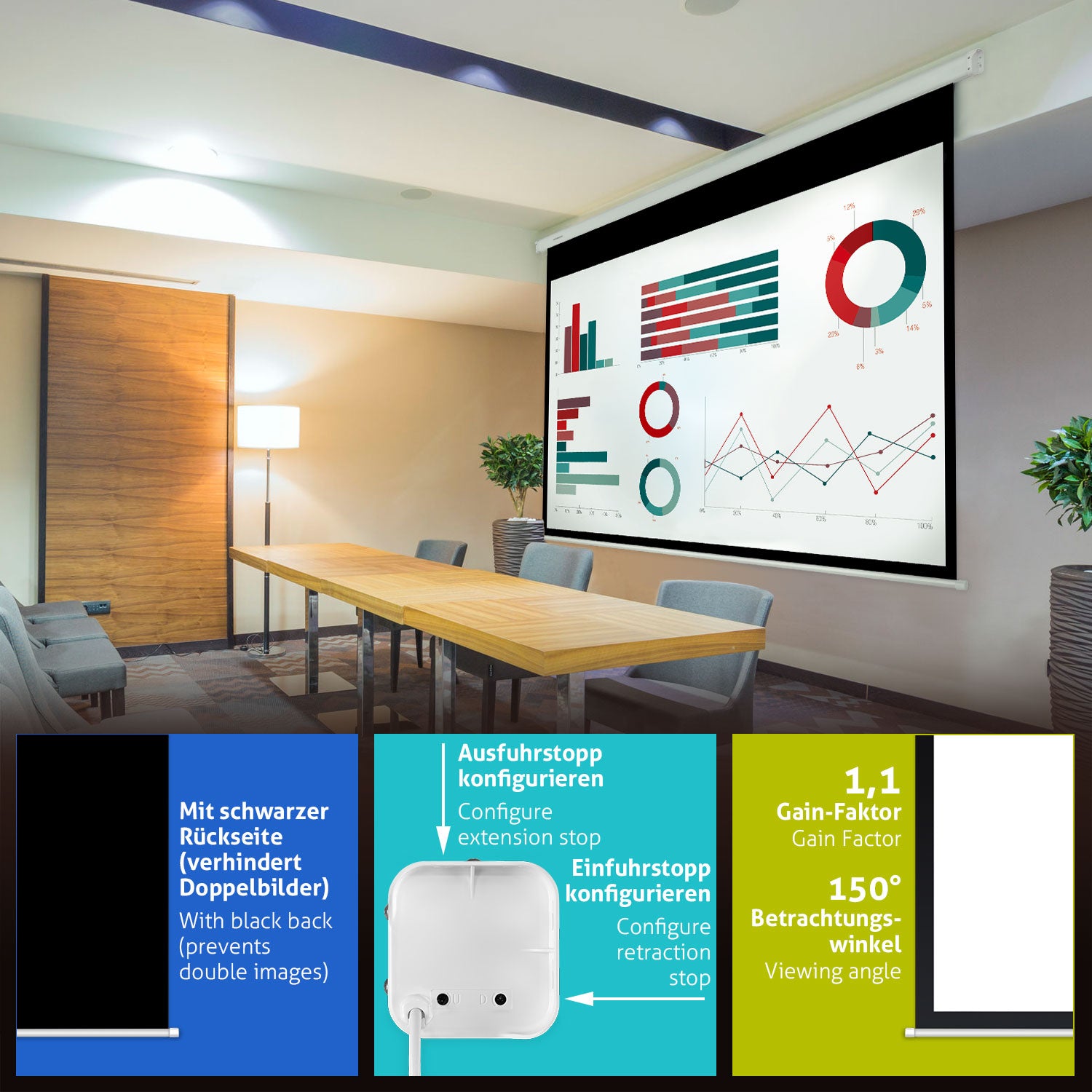 Das elegante Slimline-Tetragon-Gehäuse, das hochwertige Leinwandtuch und das umfangreiche Zubehörpaket inklusive einer Fernbedienung machen dieses Produkt zur idealen Leinwand für Heimkino, Präsentation, Schule und Business.