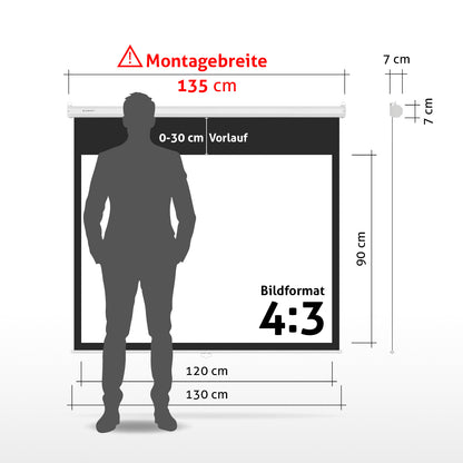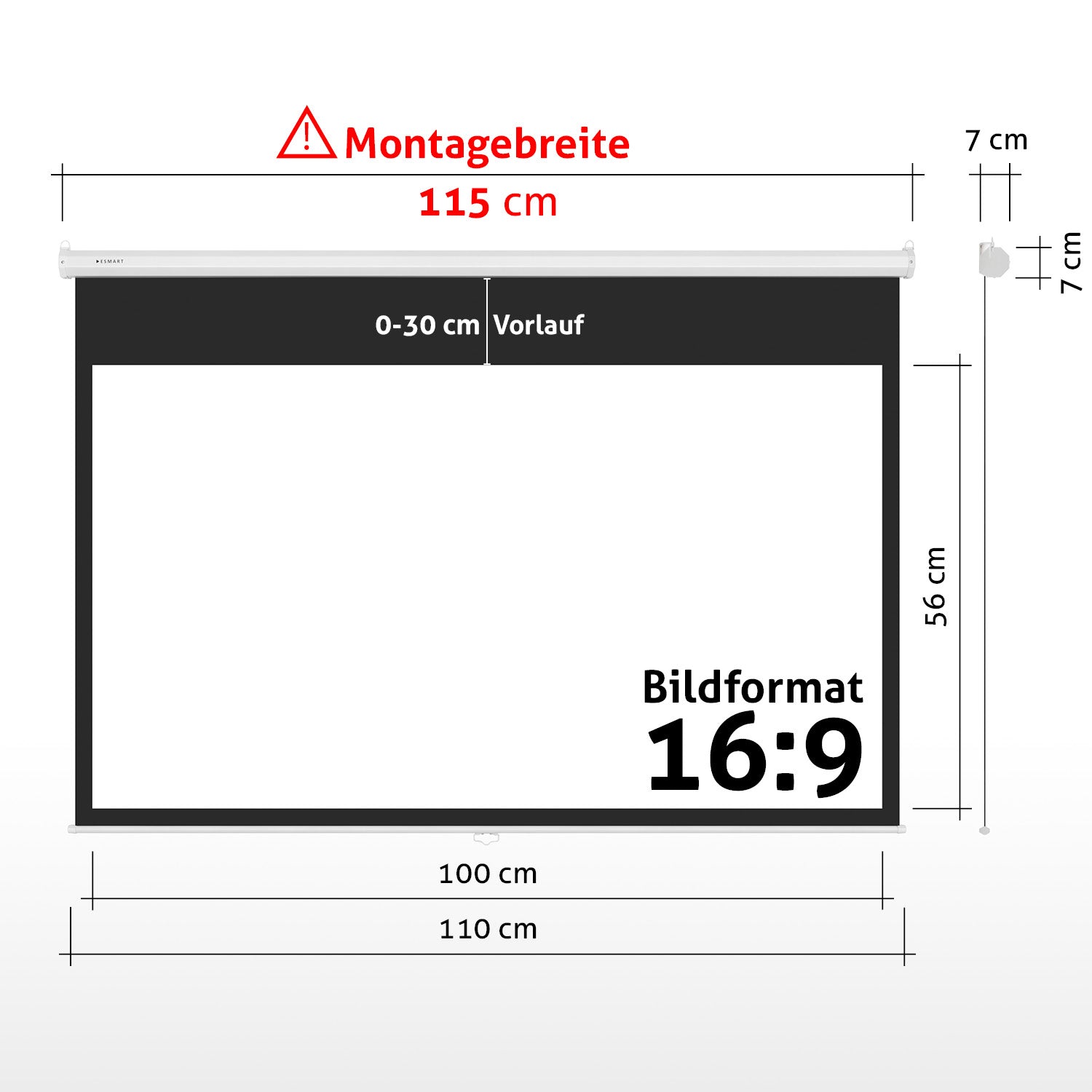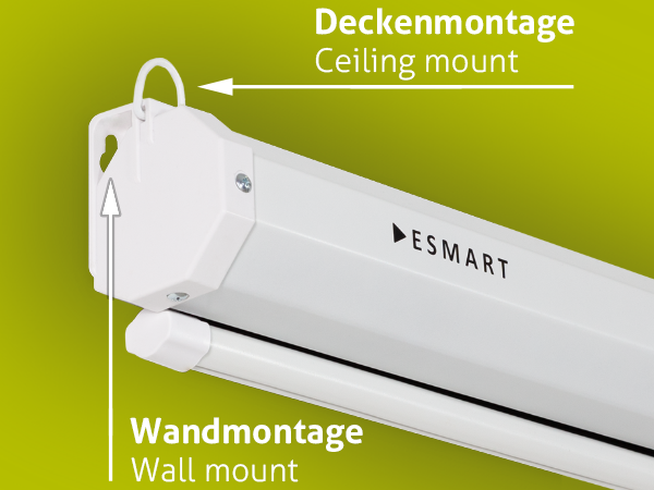 Besonders komfortabel wird die Nutzung der ESMART Rollo Leinwand durch den besonders langen schwarzen Vorlauf von bis zu 30 cm. So ist eine Deckenmontage oft ohne das Abhängen des Leinwandgehäuses möglich, ohne dass das Bild später zu hoch ist.
