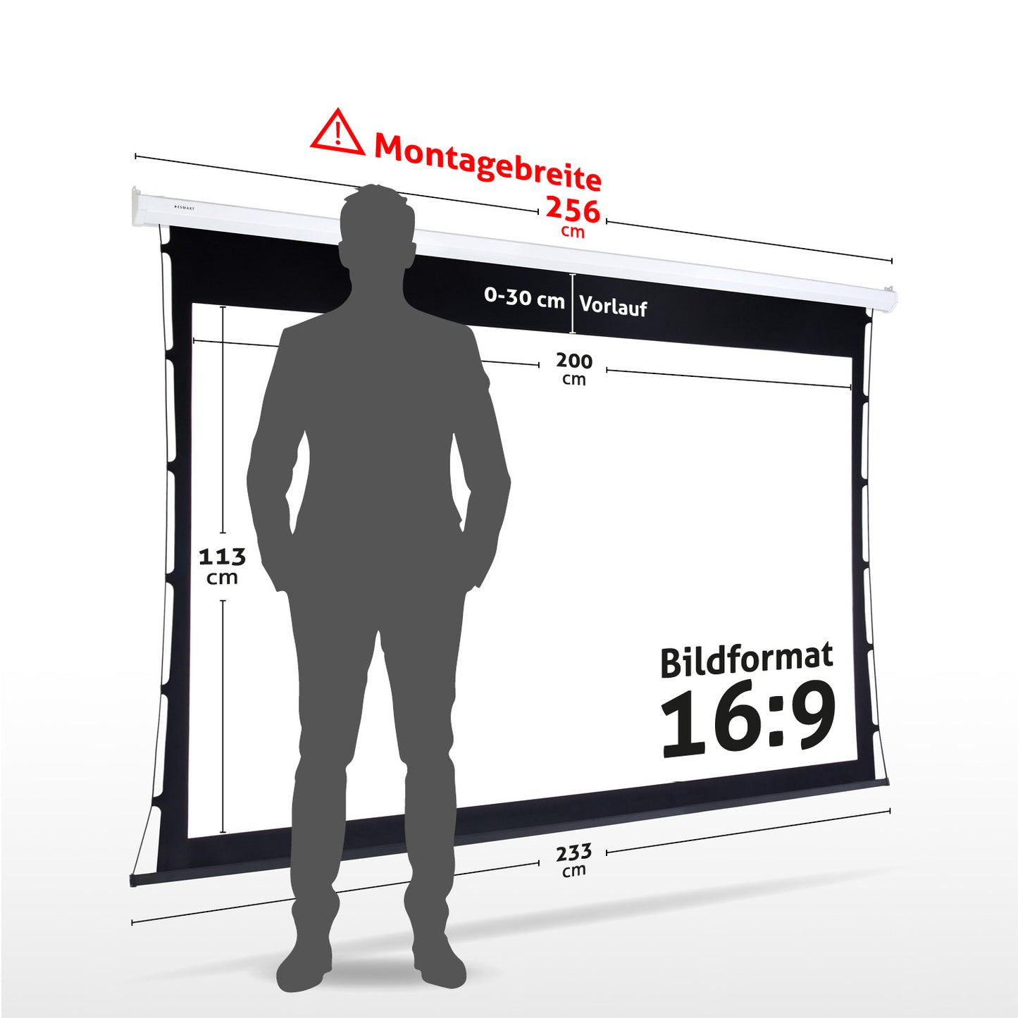 Besonders komfortabel wird die Nutzung der ESMART Tension Leinwand durch den langen schwarzen Vorlauf von bis zu 30 cm. So ist eine Deckenmontage oft ohne das Abhängen des Leinwandgehäuses möglich, ohne dass das Bild später zu hoch ist.