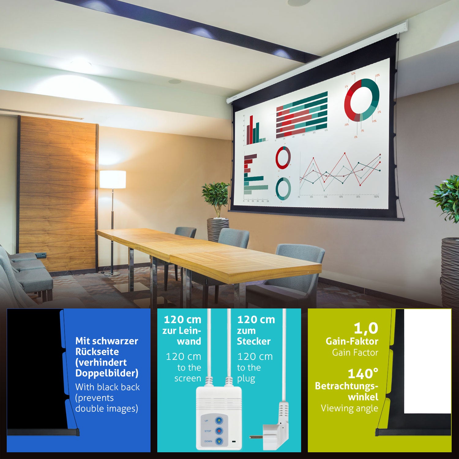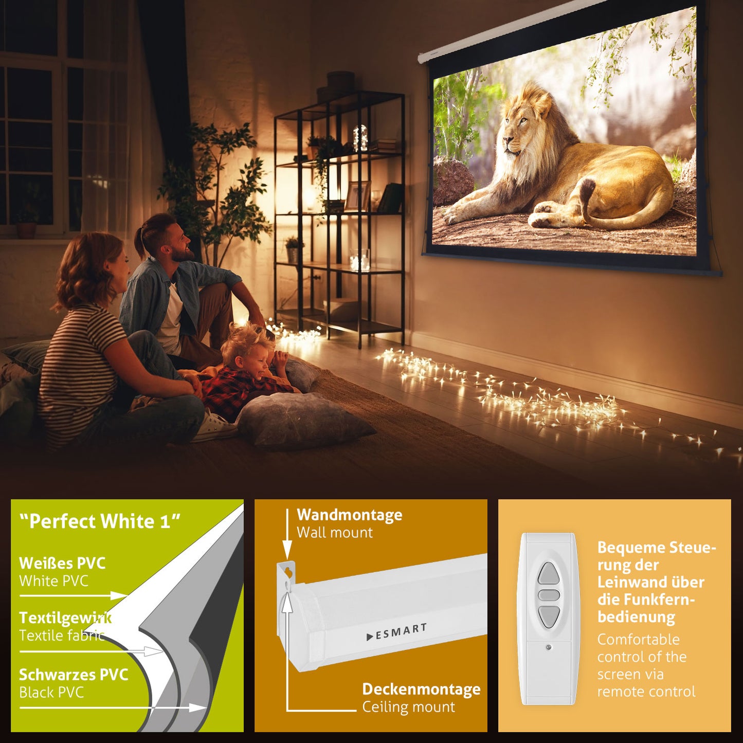 Das elegante Slimline-Oktagon-Gehäuse, das hochwertige Leinwandtuch und das umfangreiche Zubehörpaket inklusive einer Fernbedienung machen dieses Produkt zur idealen Leinwand für Heimkino, Präsentation, Schule und Business.