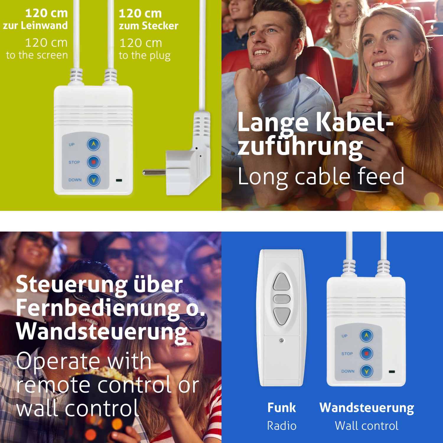 Die Leinwand ist mithilfe der Fernbedienung oder der Wandsteuerung steuerbar. |