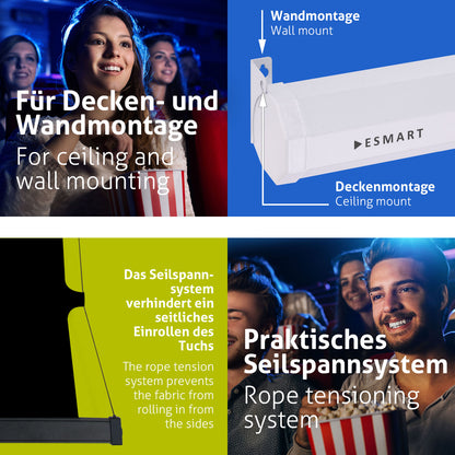 Angebracht werden kann diese elektrische Leinwand an der Decke oder an der Wand. Mithilfe des detaillierten mehrsprachigen Handbuchs ist die Montage einfach und schnell durchgeführt.