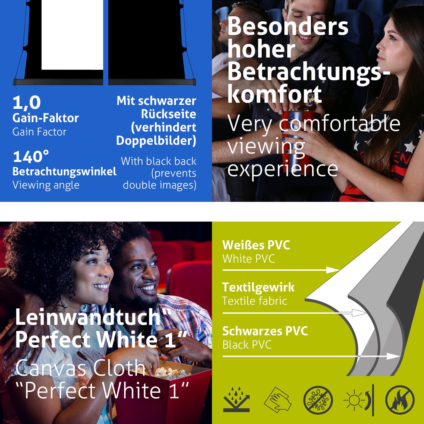 Für ein brillantes und kontrastreiches Bild sorgt der dreilagige diffus-mattweiße Leinwandstoff ESMART PerfectWhite 1. Verstärkt wird die Kontrastwahrnehmung noch durch den vollständig umlaufenden schwarzen Rand. Die schwarze Leinwandrückseite verhindert sogenannte Doppelbilder. Durch die Optimierung der Leinwandoberfläche für LED-, LCD- und DLP-Projektoren eignet sich diese Leinwand für alle privaten und geschäftlichen Anwendungen. Der hohe Betrachtungswinkel wird erreicht, indem das eintreffende Licht gleichmäßig in alle Richtungen verteilt wird. Die Projektion erscheint immer gleichmäßig ausgeleuchtet, kontrastreich und farbintensiv ohne hellere oder dunklere Stellen.