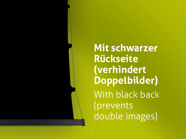 Die Rückseite des Leinwandstoffs ist schwarz und blickdicht, wodurch das projizierte Bild hell und farbintensiv auf der Vorderseite verbleibt und sogenannte Doppelbilder verhindert werden.