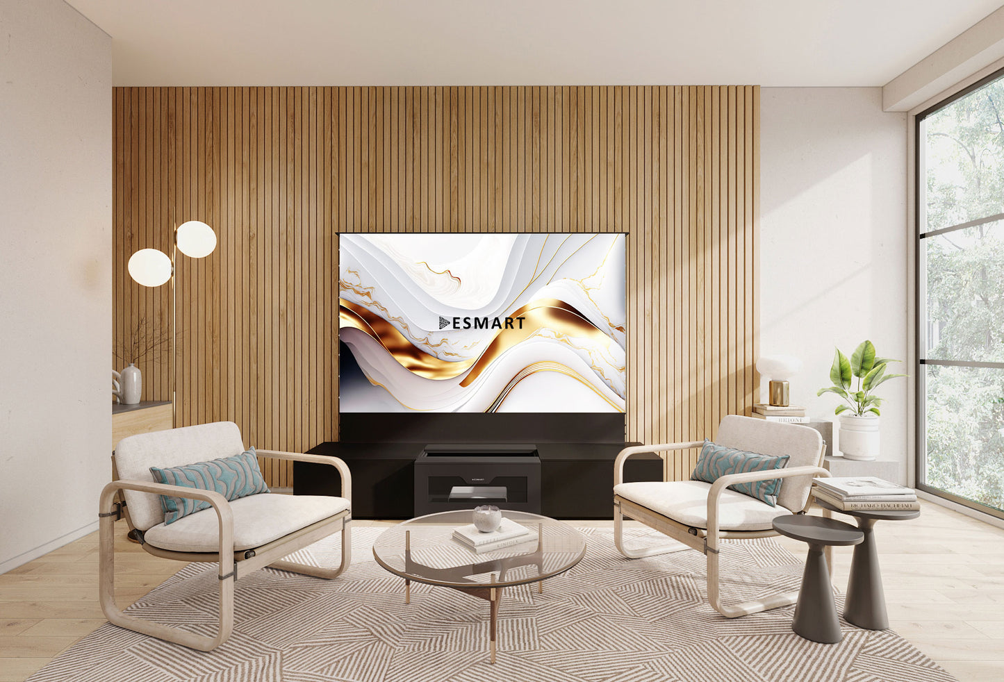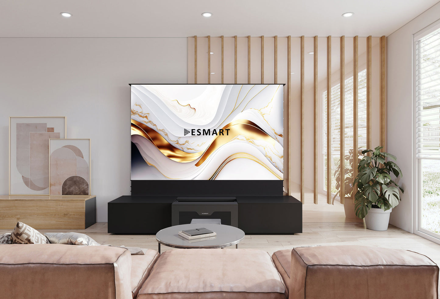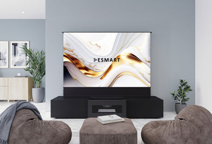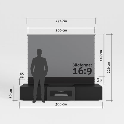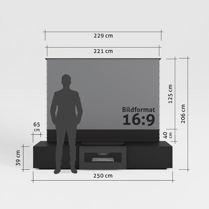 Dieses Paket umfasst sowohl das motorisierte Lowboard als auch den motorisierten ESMART Expert FSX-ALR CBSP Tension Bildschirm, die nahtlos zusammenarbeiten, um ein beeindruckendes Kinoerlebnis in Ihrem Wohnzimmer zu bieten.