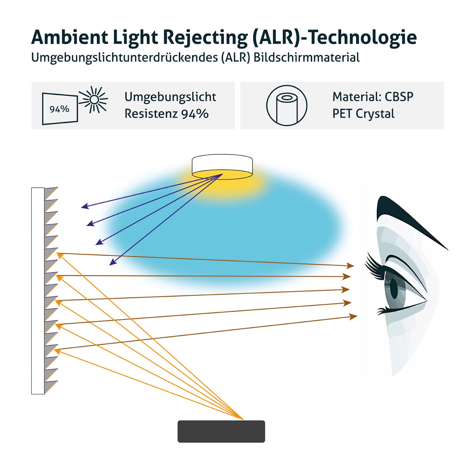 Die CBSP Oberfläche maximiert den Kontrast und die Helligkeit Deiner Projektion, selbst in Umgebungen mit viel Umgebungslicht. Die Oberfläche ist mit Mikrostrukturen versehen, wodurch 94% des Umgebungslichts remittiert werden, sodass Du gestochen scharfe Bilder mit lebendigen Farben und tiefem Schwarzwert genießen kannst. Durch die Verwendung des ALR CBSP Hochkontrast Bildschirms kannst Du Deinen Projektor als Alternative zu einem herkömmlichen Fernseher nutzen.