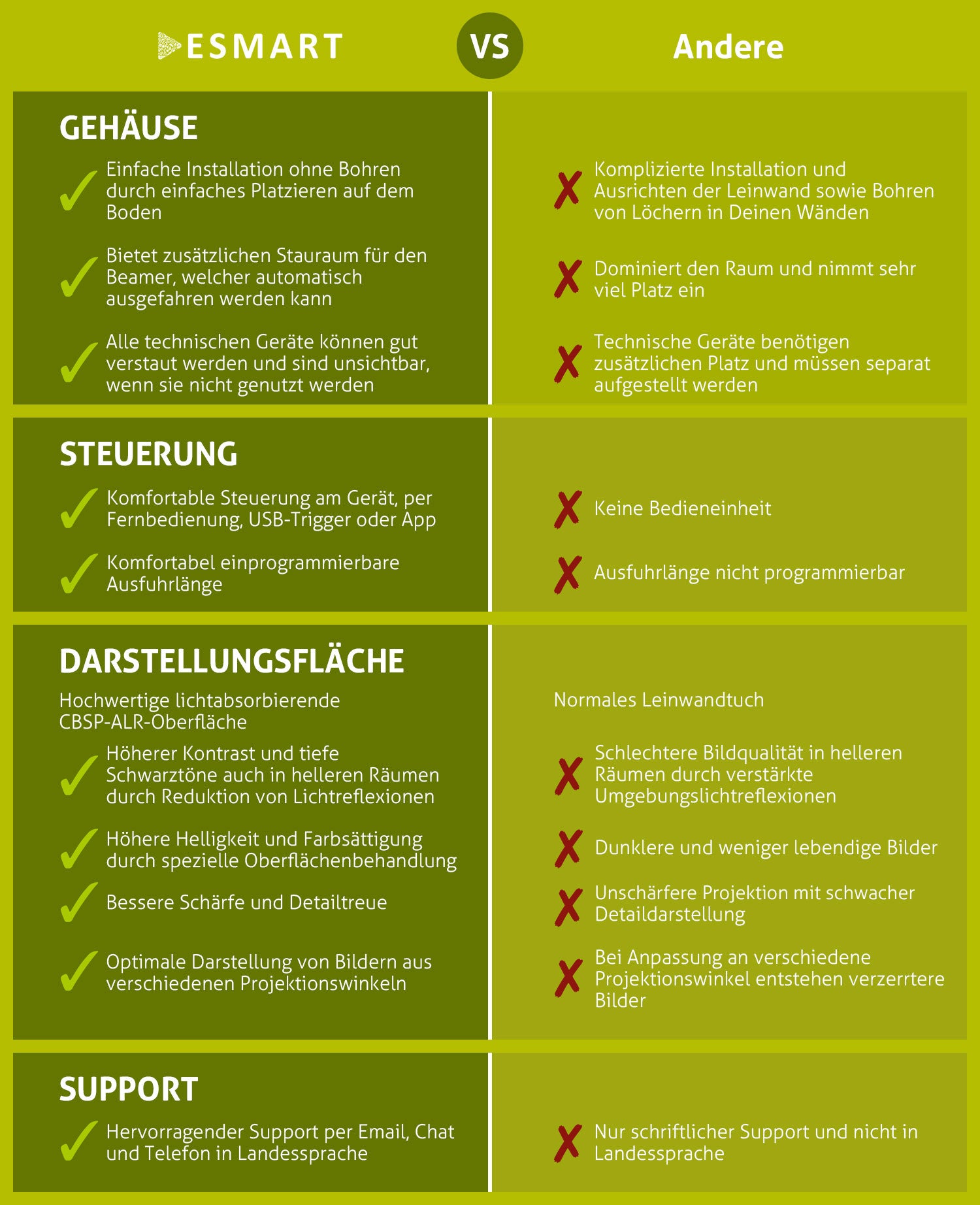 Das elegante Gehäuse, das umfangreiche Zubehörpaket inklusive einer programmierbaren Fernbedienung und einem USB-Trigger machen dieses Produkt zum idealen Bildschirm für Heimkino, Präsentation, Schule und Business. Mit der neuen CBSP Oberfläche und einem innovativen Lowboard, das automatisch den Bilschirm und den Beamer herausfährt, setzt dieses Produkt neue Maßstäbe. Zudem lässt sich der Bildschirm bequem über eine App steuern, was zusätzliche Flexibilität bietet.