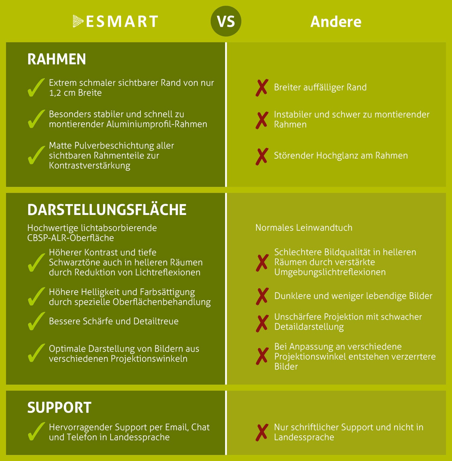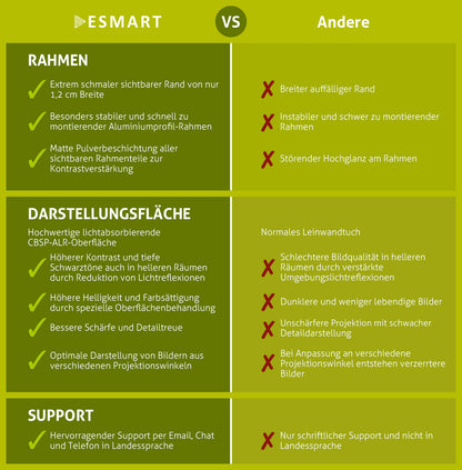 Die ESMART CBSP Oberfläche maximiert den Kontrast und die Helligkeit Deiner Projektion, selbst in Umgebungen mit viel Umgebungslicht. Die Oberfläche ist mit Mikrostrukturen versehen, wodurch störende Lichtreflexionen vermieden werden, sodass Du gestochen scharfe Bilder mit lebendigen Farben und tiefem Schwarzwert genießen kannst. Durch die Verwendung unseres ALR Hochkontrast Bildschirms kannst Du Deinen Projektor als Alternative zu einem herkömmlichen Fernseher nutzen.