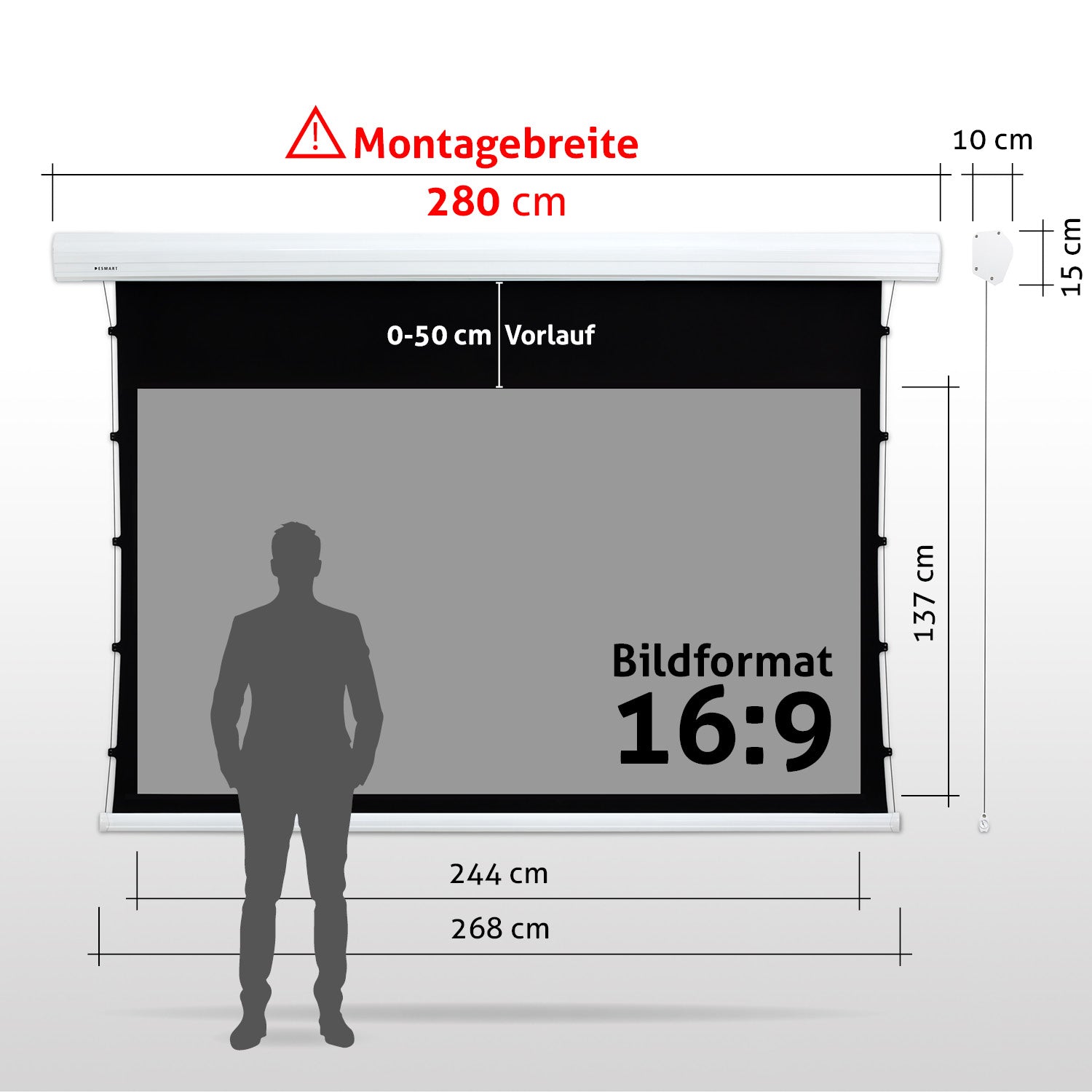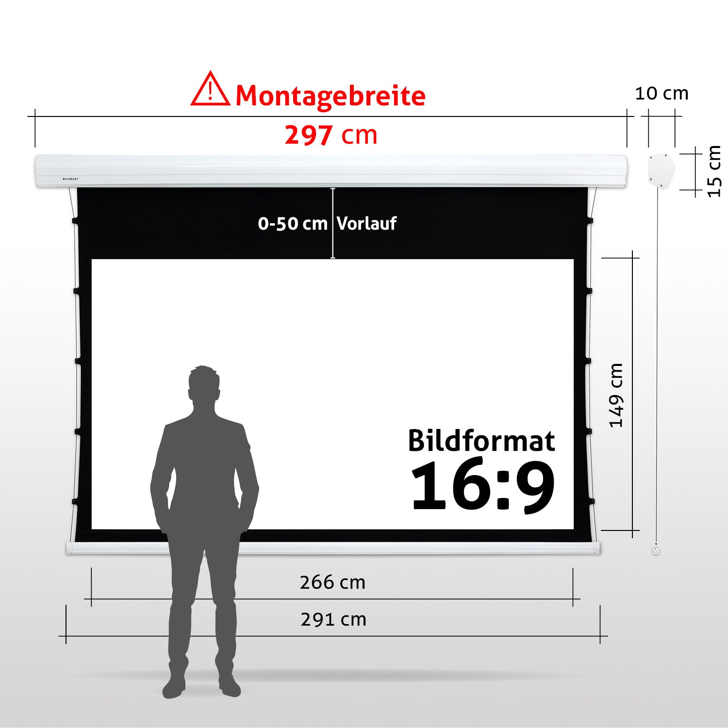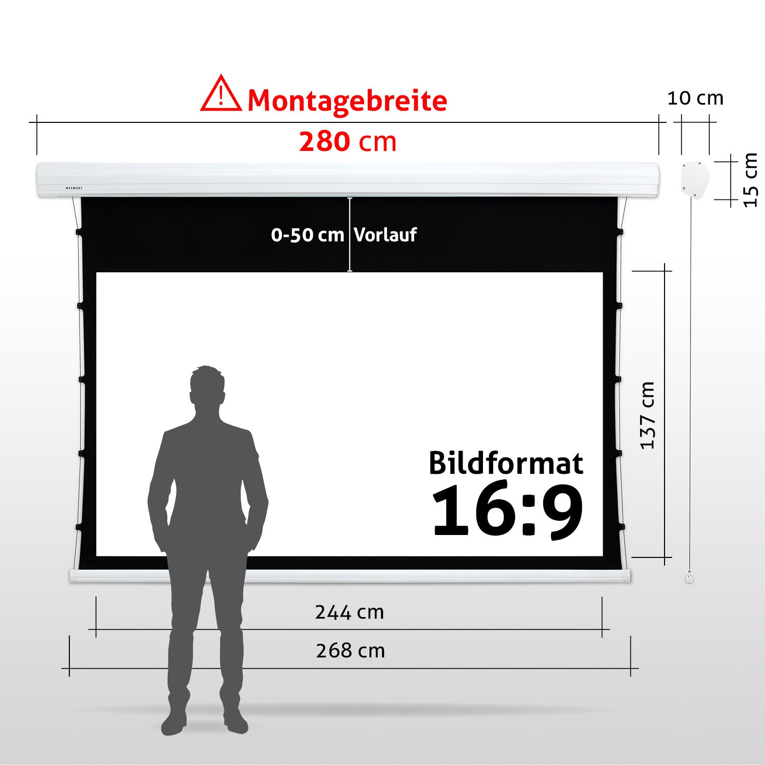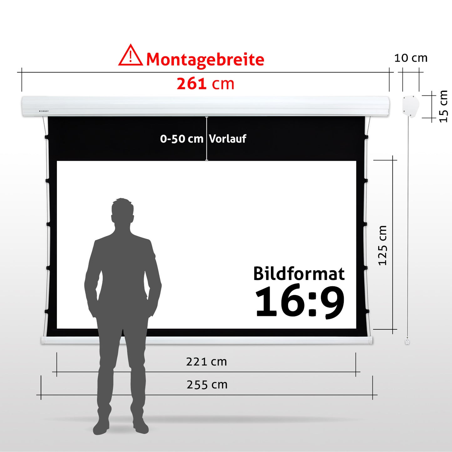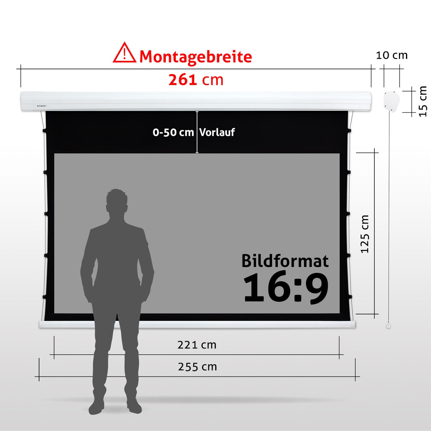 - Leinwandgehäuse: 261 cm x 15 cm x 10 cm (B x H x T)