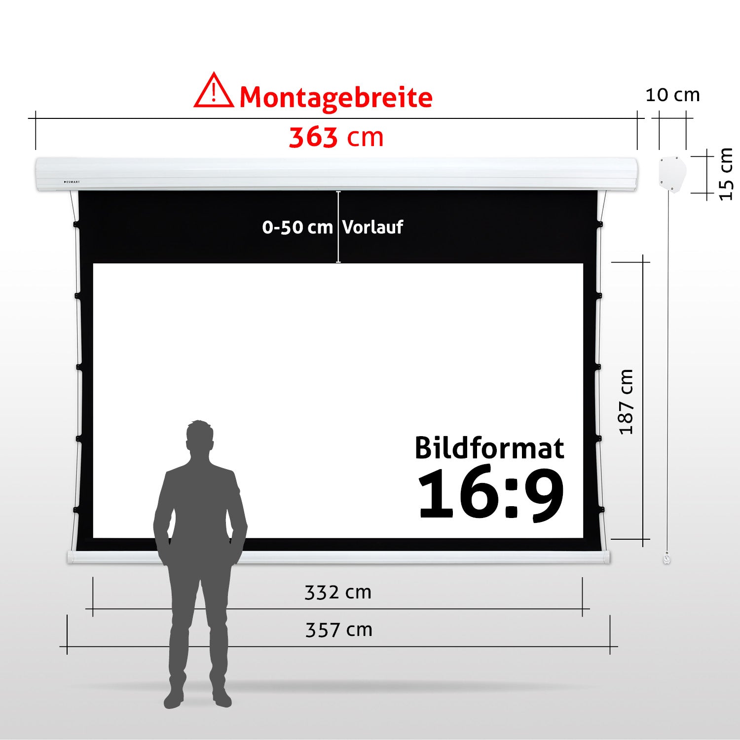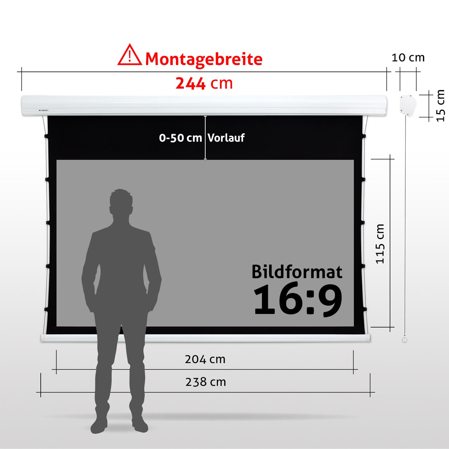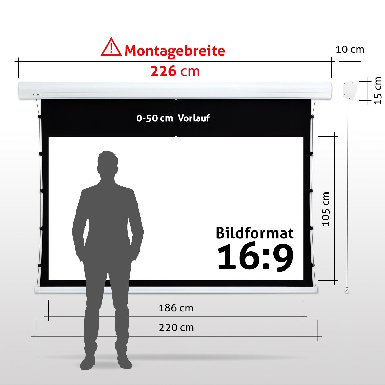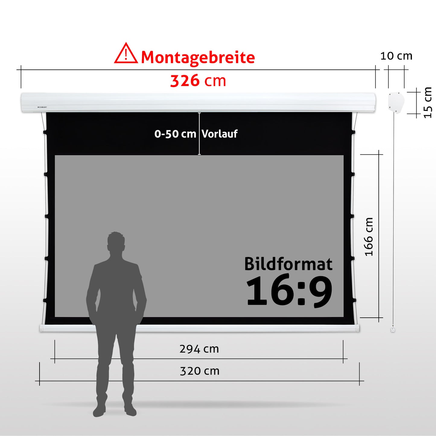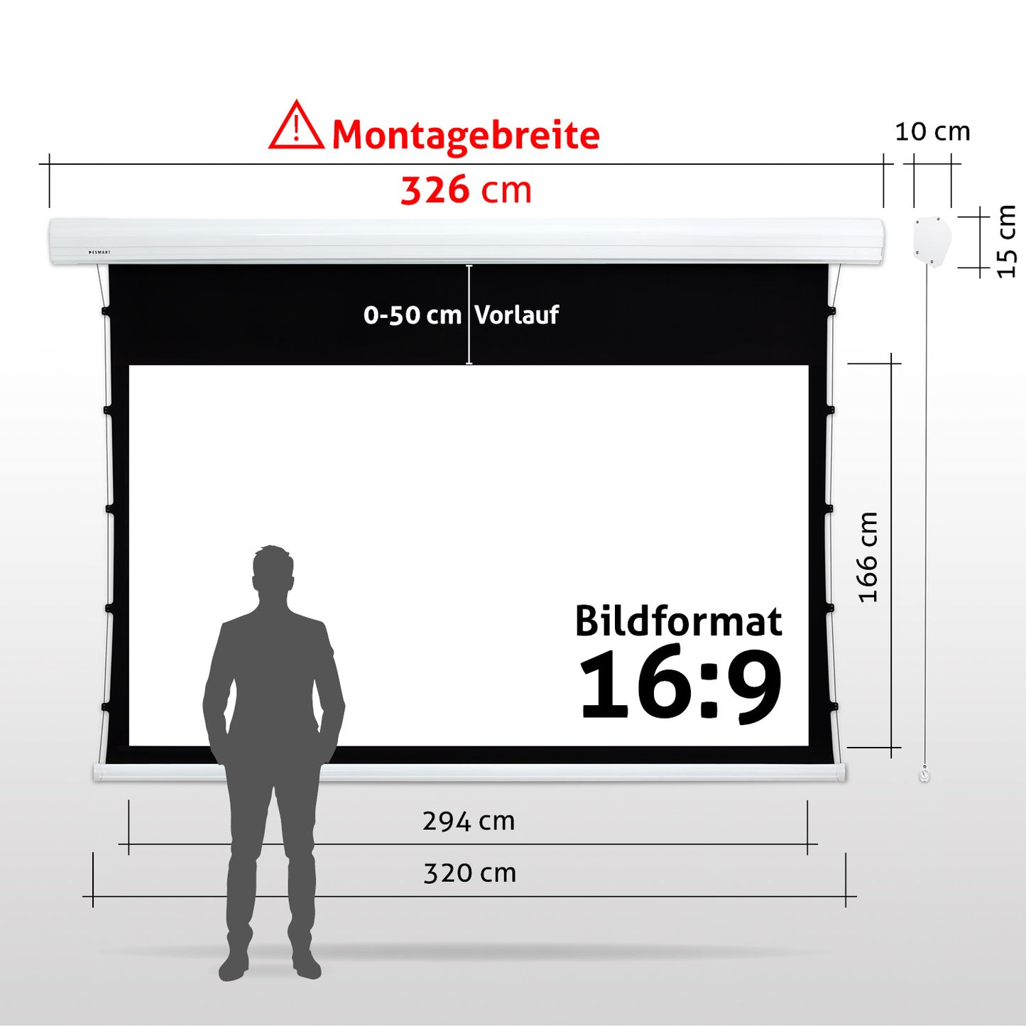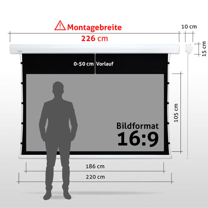 - Leinwandgehäuse: 261 cm x 15 cm x 10 cm (B x H x T)