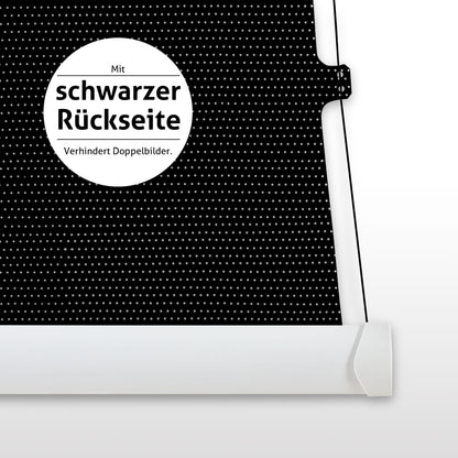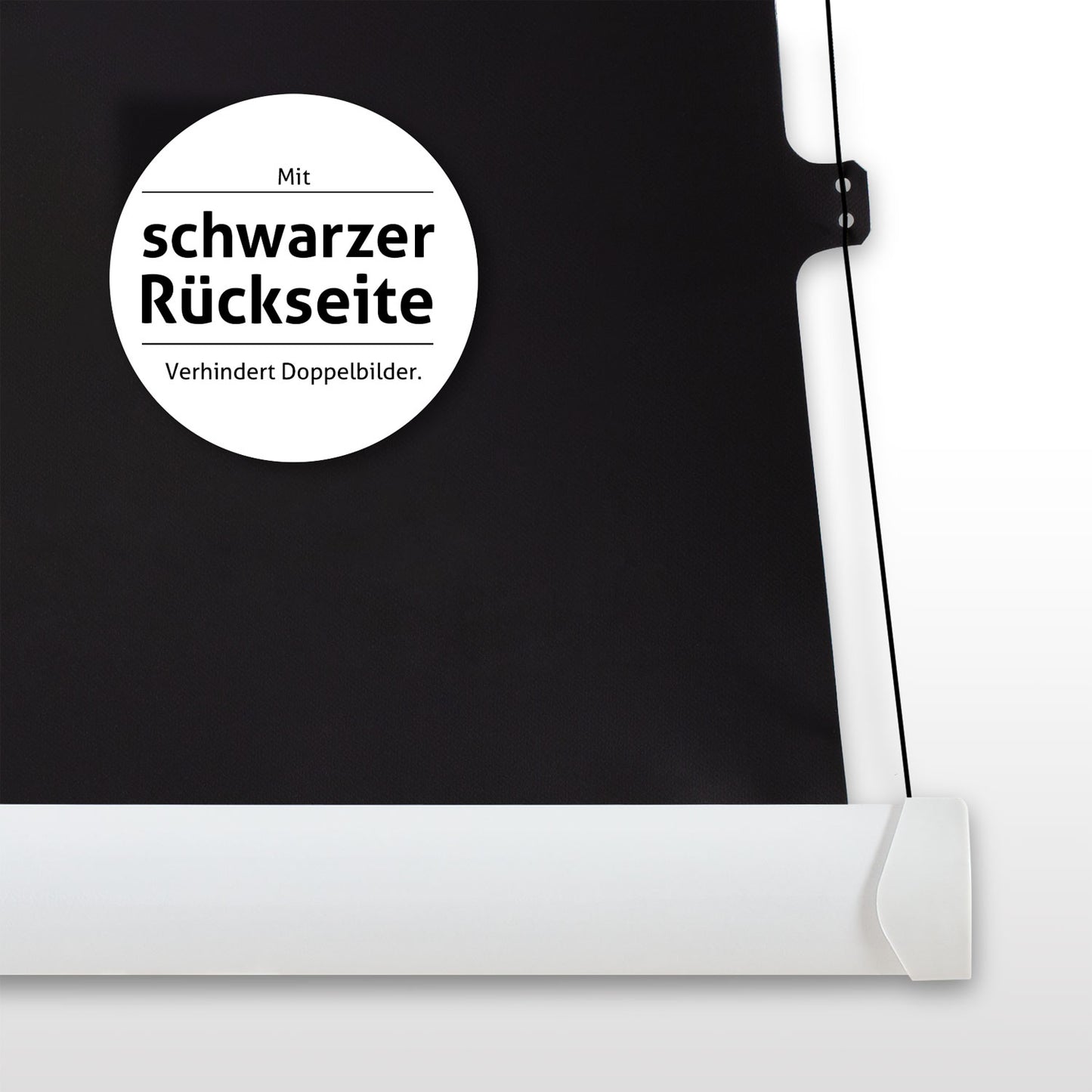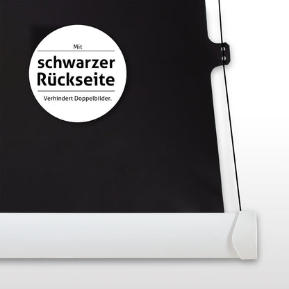Das undurchsichtige Leinwandtuch reflektiert den auftreffenden Lichtstrahl einheitlich in alle Richtungen. Ohne hellere oder dunklere Stellen erscheint die Projektion immer gleichmäßig ausgeleuchtet. Dadurch bleibt das projizierte Lichtbild auf der Vorderseite hell und farbintensiv. Sogenannte Doppelbilder werden durch die schwarze, lichtundurchlässige Leinwandrückseite ausgeschlossen.