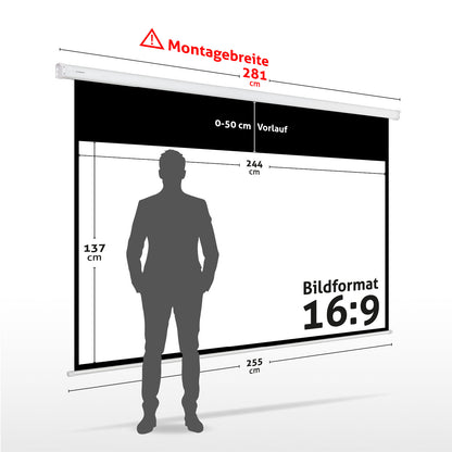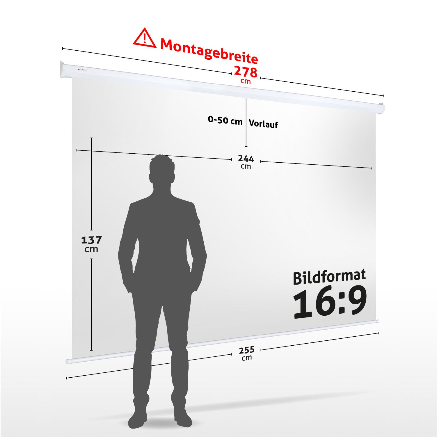 | 16:9 | 244 x 137 (110") | 281 x 8,8 x 8,8 cm | 255 cm | max. 50 cm | 4/4/4 cm | Tetragon |