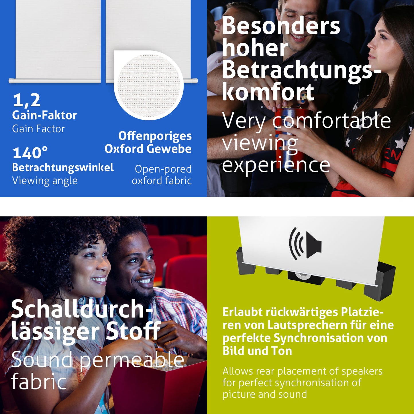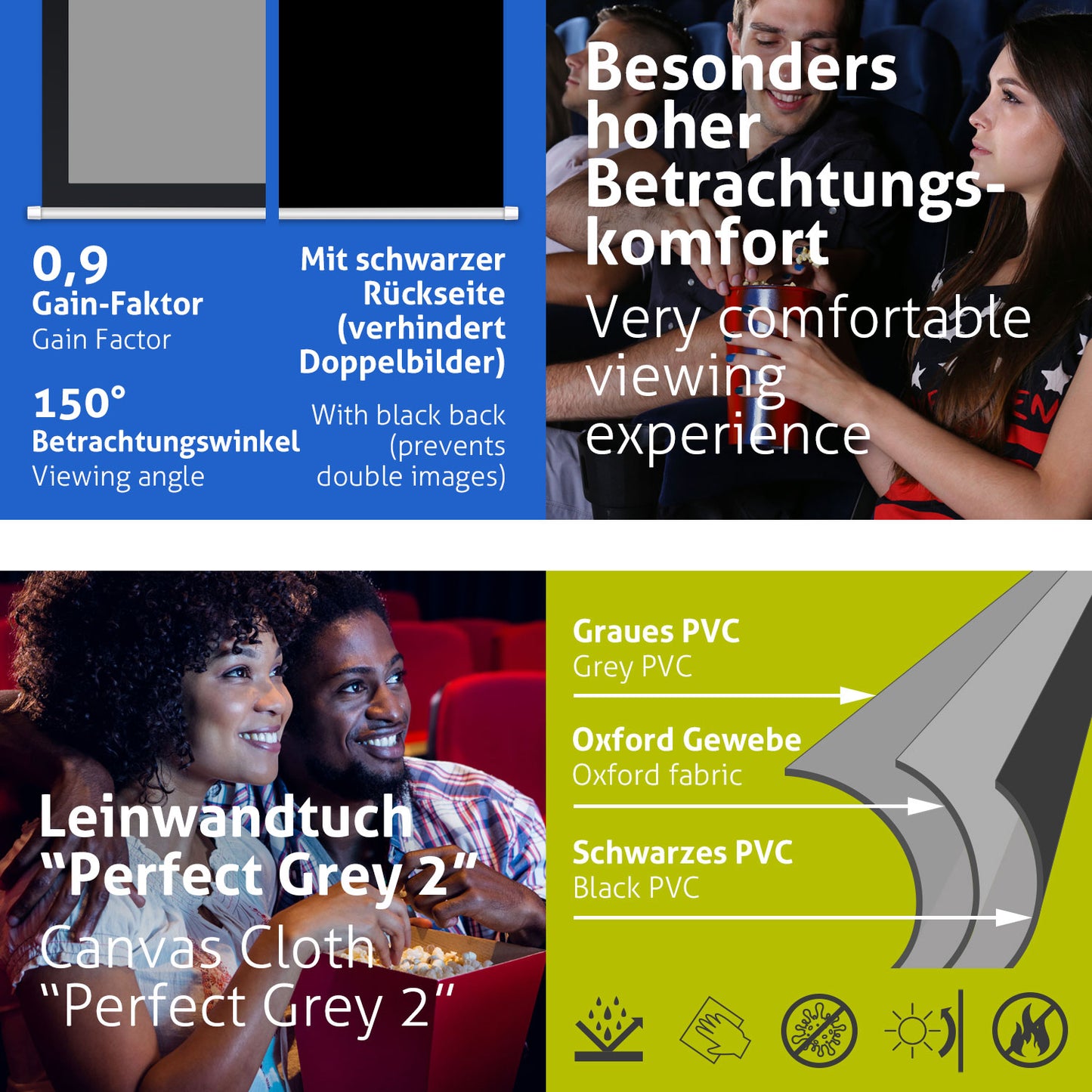 Für ein brillantes und kontrastreiches Bild sorgt der dreilagige diffus-mattweiße Leinwandstoff ESMART PerfectWhite 2. Verstärkt wird die Kontrastwahrnehmung noch durch den vollständig umlaufenden schwarzen Rand. Die schwarze Leinwandrückseite verhindert sogenannte Doppelbilder. Durch die Optimierung der Leinwandoberfläche für LED-, LCD- und DLP-Projektoren eignet sich diese Leinwand für alle privaten und geschäftlichen Anwendungen. Der hohe Betrachtungswinkel wird erreicht, indem das eintreffende Licht gleichmäßig in alle Richtungen verteilt wird. Die Projektion erscheint immer gleichmäßig ausgeleuchtet, kontrastreich und farbintensiv ohne hellere oder dunklere Stellen.