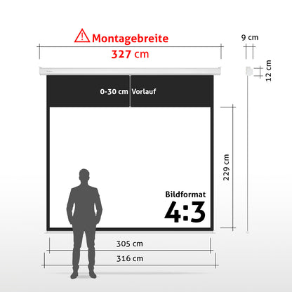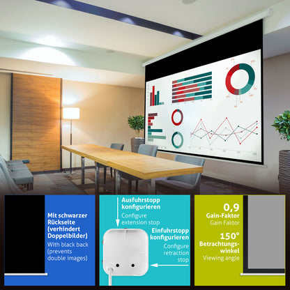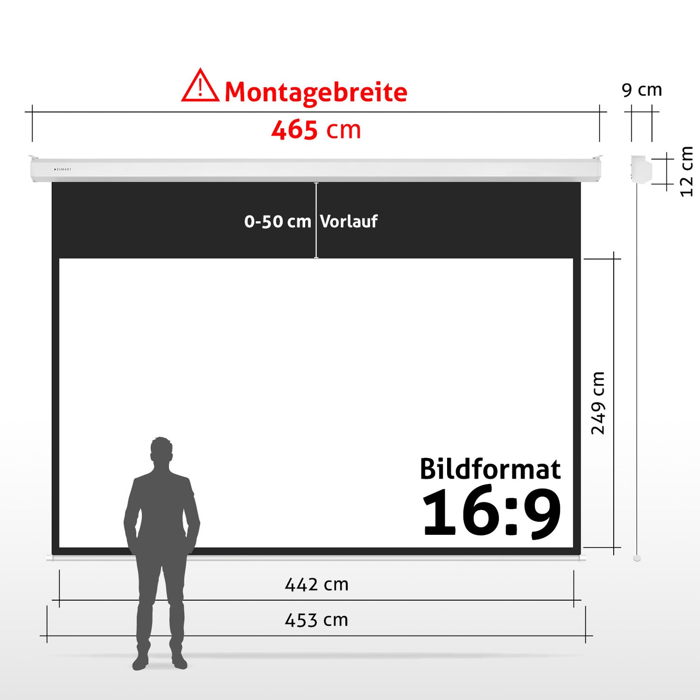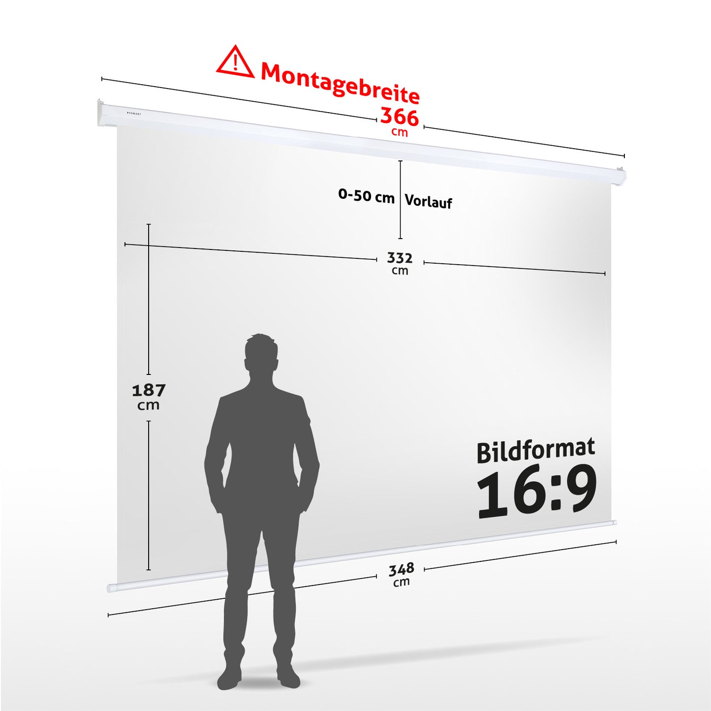 Besonders komfortabel wird die Nutzung der ESMART MIMOTO Leinwand durch den besonders langen schwarzen Vorlauf von bis zu 50 cm. So ist eine Deckenmontage oft ohne das Abhängen des Leinwandgehäuses möglich, ohne dass das Bild später zu hoch ist.