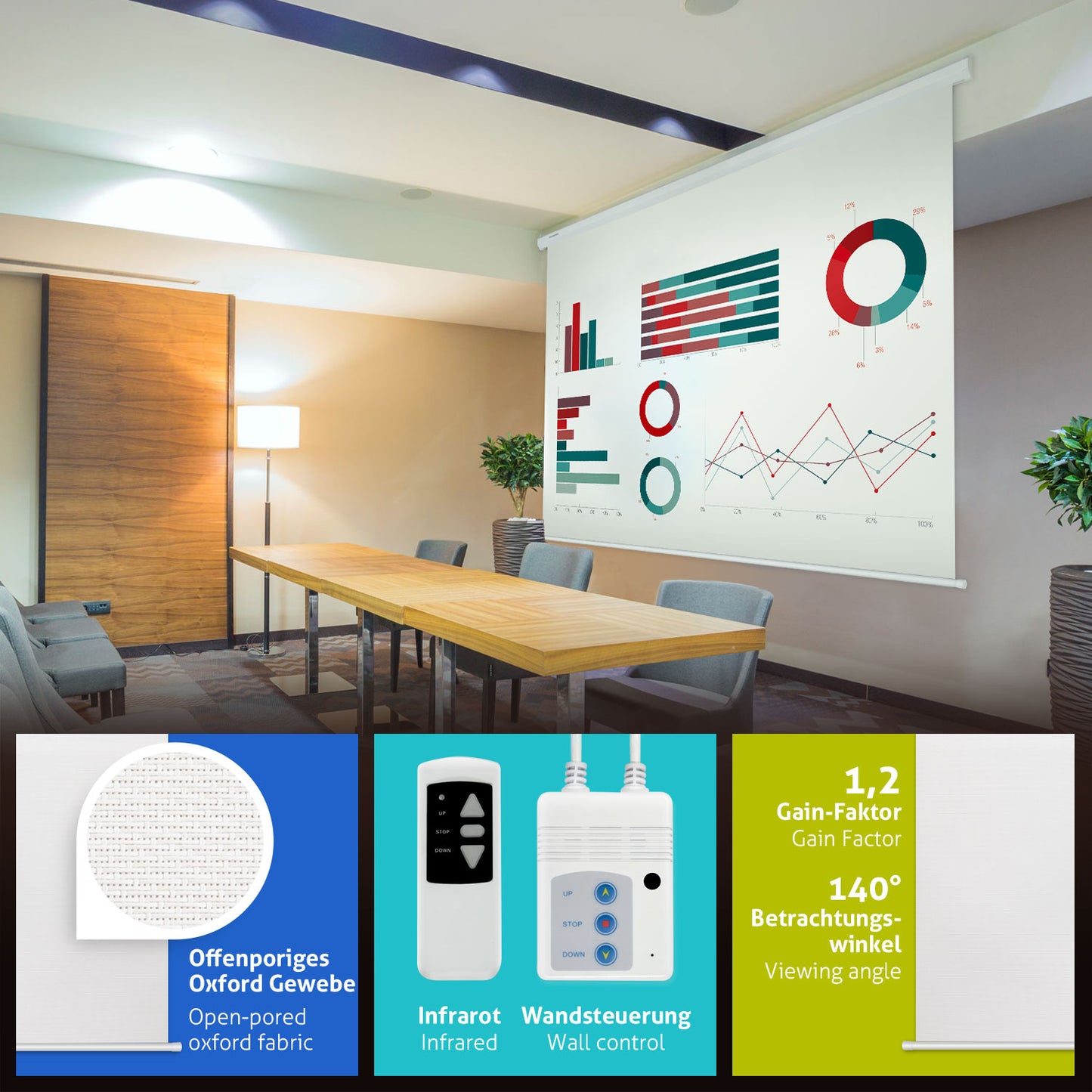 Mithilfe der programmierbaren Fernbedienung kannst Du die Leinwand komfortabel bedienen. Es ist sogar möglich, mit der Fernbedienung die Ausfuhrlänge des Leinwandstoffs festzulegen und abzuspeichern. |