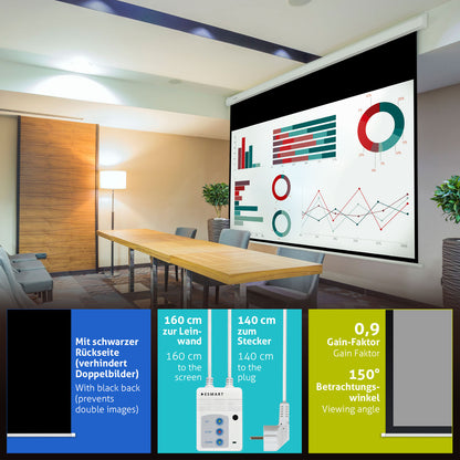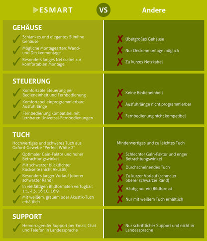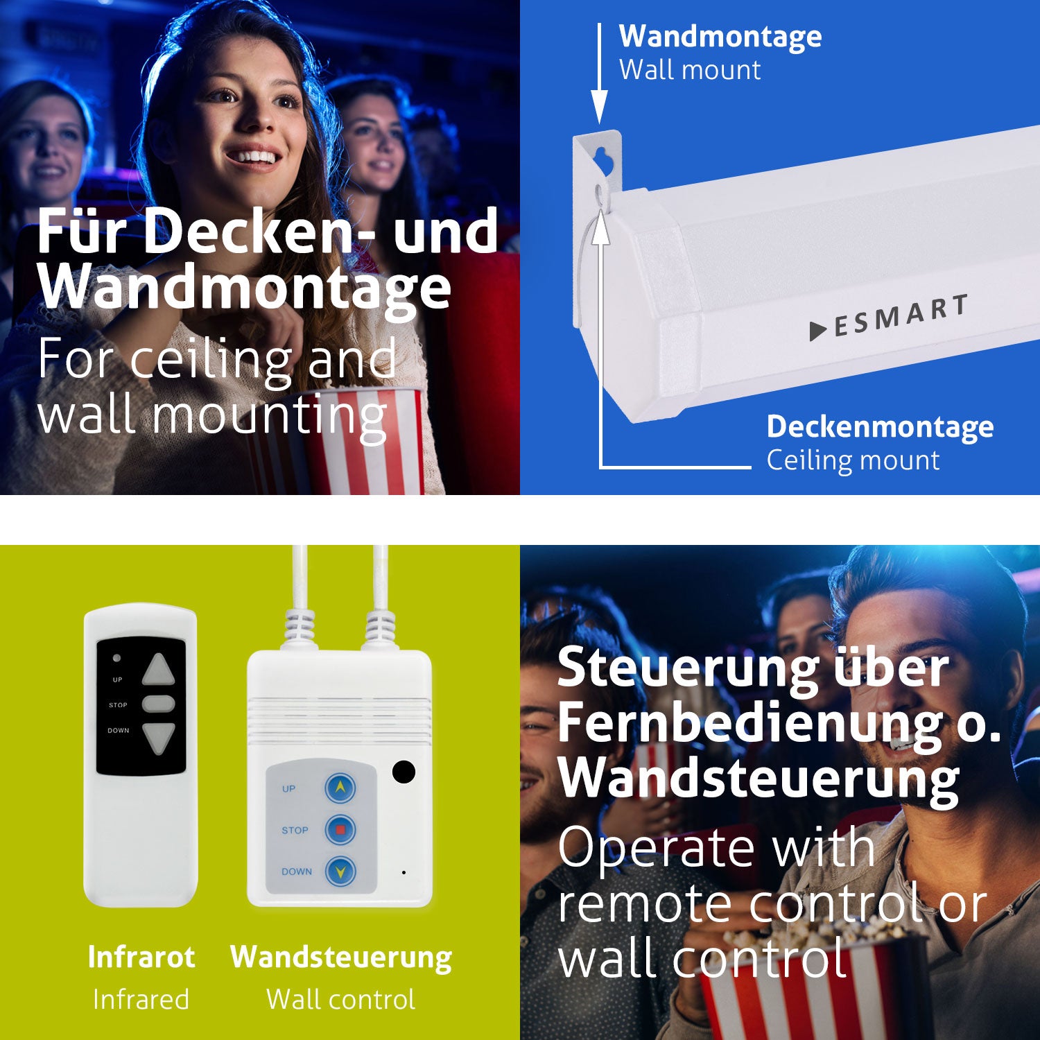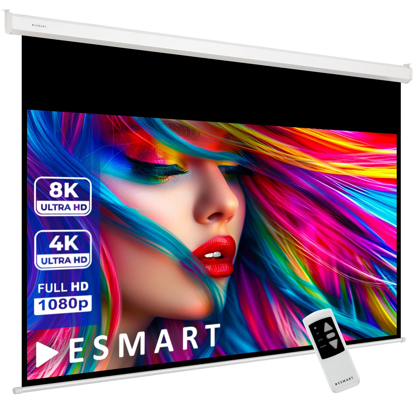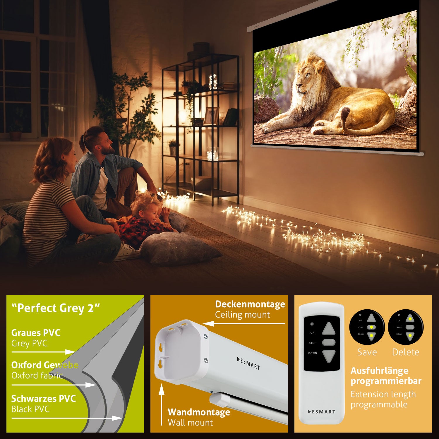 Das elegante Slimline-Tetragon-Gehäuse, das ESMART PerfectWhite 2 Leinwandtuch und das umfangreiche Zubehörpaket inklusive einer programmierbaren Fernbedienung machen dieses Produkt zur idealen Leinwand für Heimkino, Präsentation, Schule und Business.