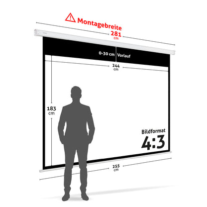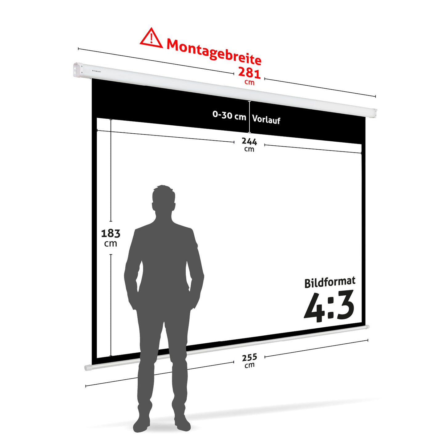 | 4:3 | 244 x 183 (120") | 281 x 8,8 x 8,8 cm | 255 cm | max. 30 cm | 4/4/4 cm | Tetragon |