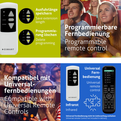 Die Steuerung der MIMOTO Leinwand erfolgt entweder über die Wandsteuerung oder über die Infrarot-Fernbedienung. Mit der Fernbedienung kannst Du die Ausfuhrlänge einfach und bequem dauerhaft speichern. Mit der ESMART Infrarot-Fernbedienung kannst Du jede lernbare Universal-Fernbedienung anlernen. So kannst Du Dein Heimkino mit nur einer Fernbedienung steuern.
