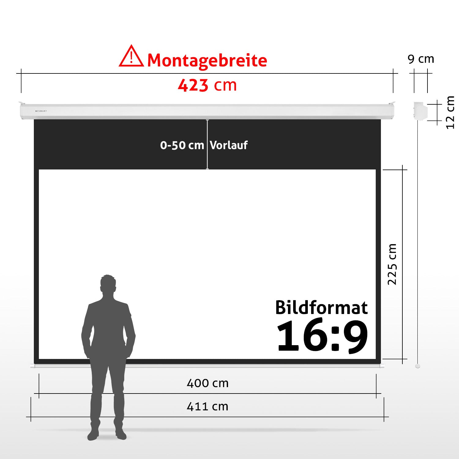 | 16:9 | 400 x 225 (180") | 437 x 12 x 9 cm | 411 cm | max. 50 cm | 4/4/4 cm | Hexagon |