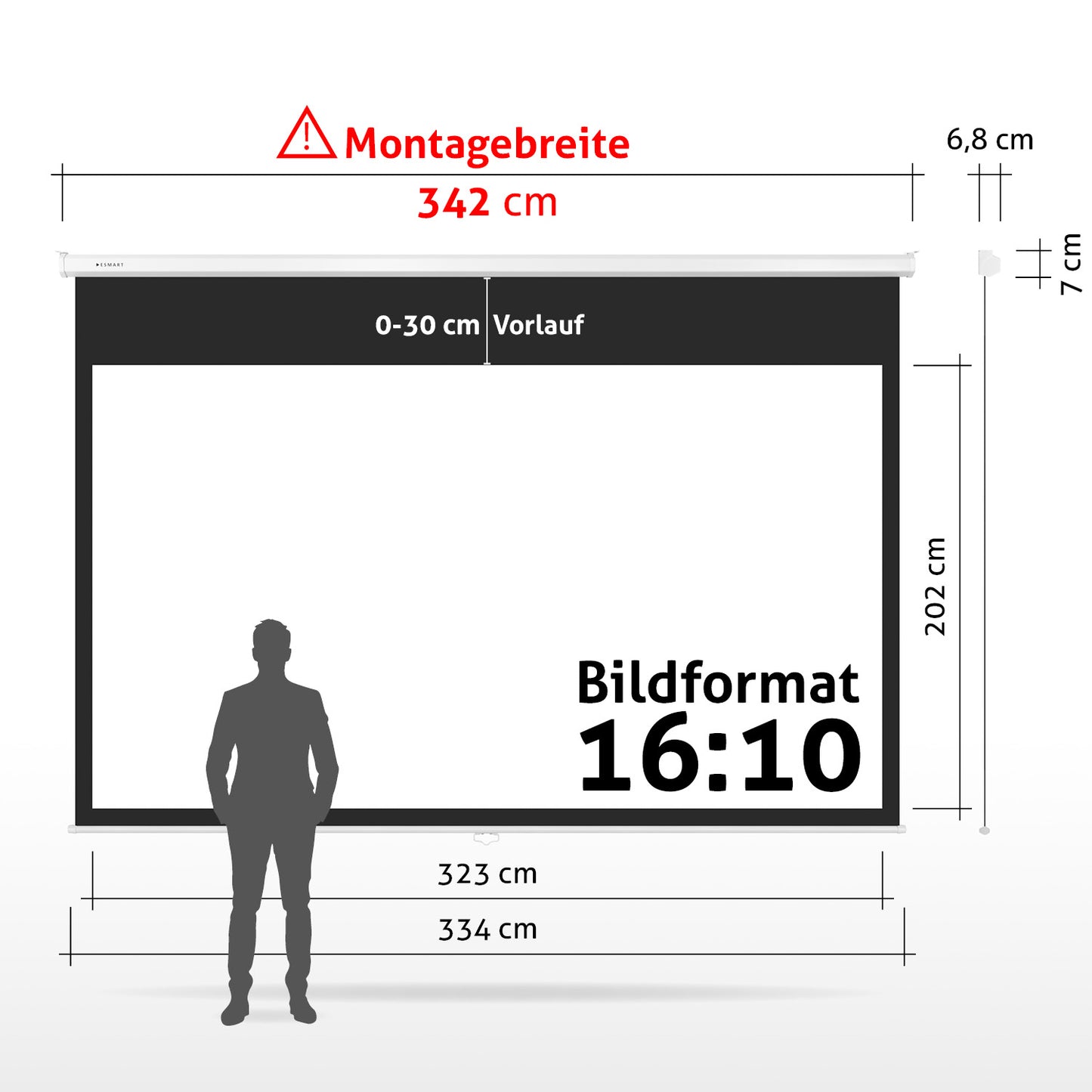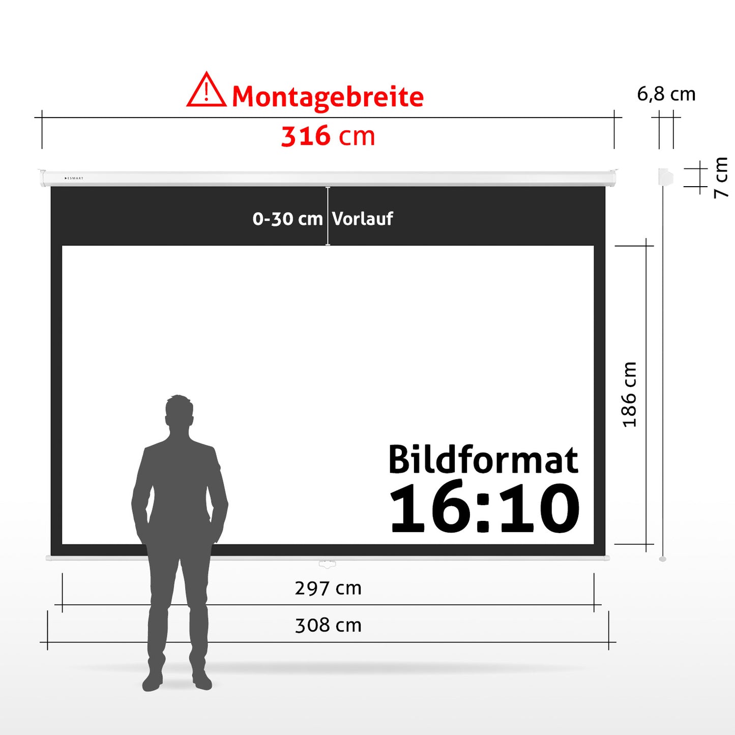 Besonders komfortabel wird die Nutzung der ESMART MIROLO Leinwand durch den besonders langen schwarzen Vorlauf von bis zu 50 cm. So ist eine Deckenmontage oft ohne das Abhängen des Leinwandgehäuses möglich, ohne dass das Bild später zu hoch ist.
