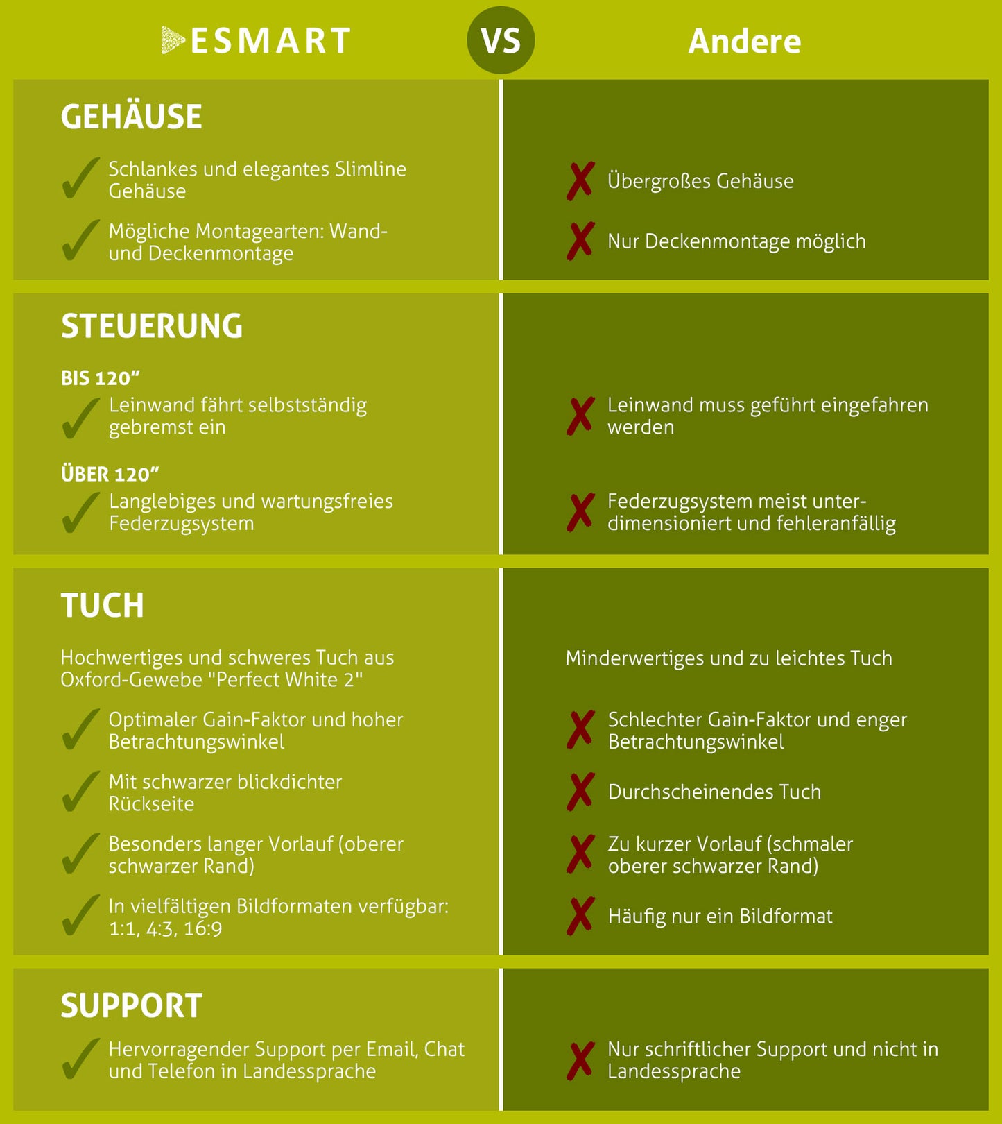 | Bildmaße | bis 332 x 187 (150") | bis 442 x 249 cm (200") | bis 332 x 187 (150") | bis 443 x 249 cm (200") | bis 266 x 149 cm (120") | bis 443 x 249 cm (200") |