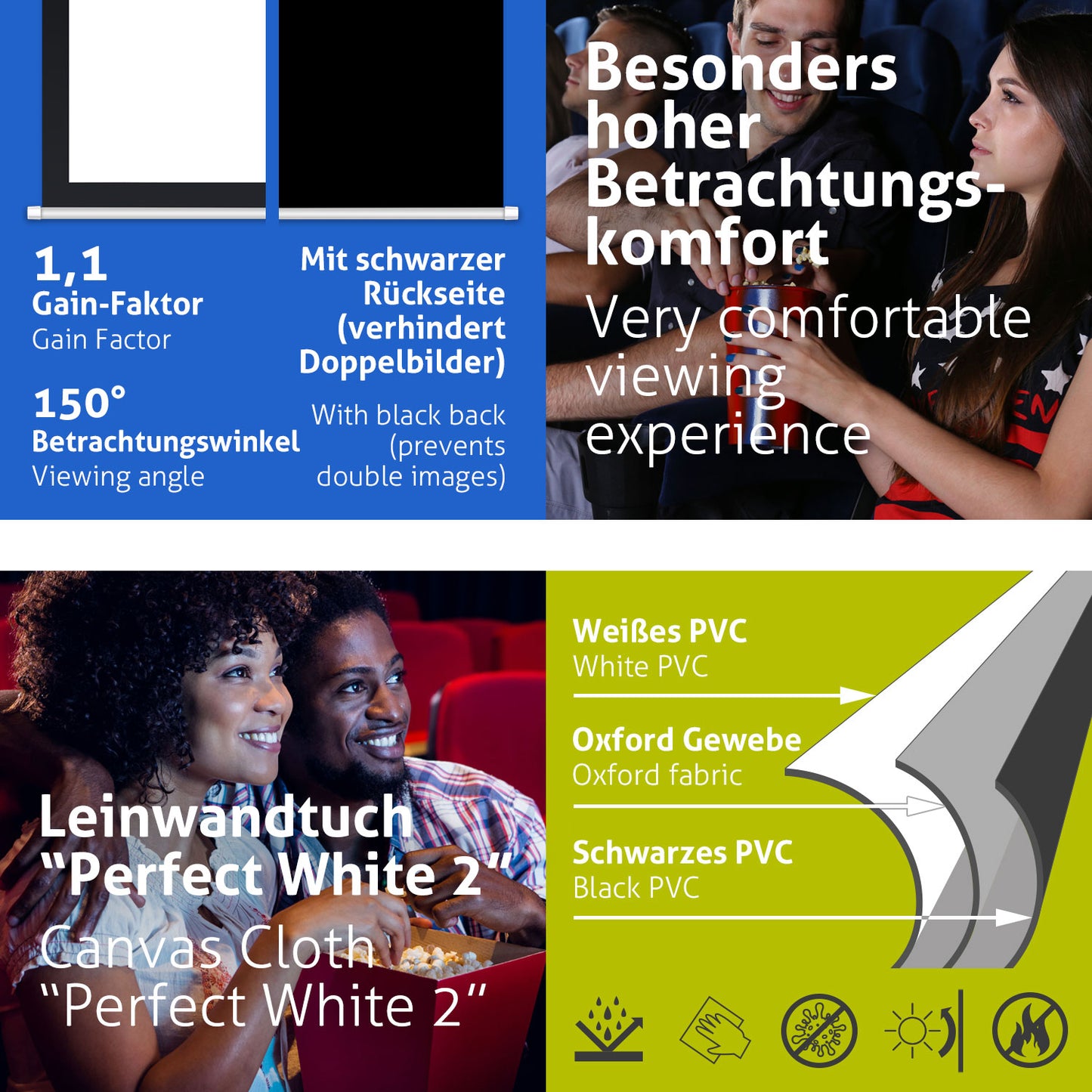 Das matt-diffuse ESMART PerfectWhite 2 Leinwandtuch besteht aus mehreren Schichten. Es ist wasserabweisend, abwaschbar, schimmelresistent, blickdicht und schwer entflammbar.