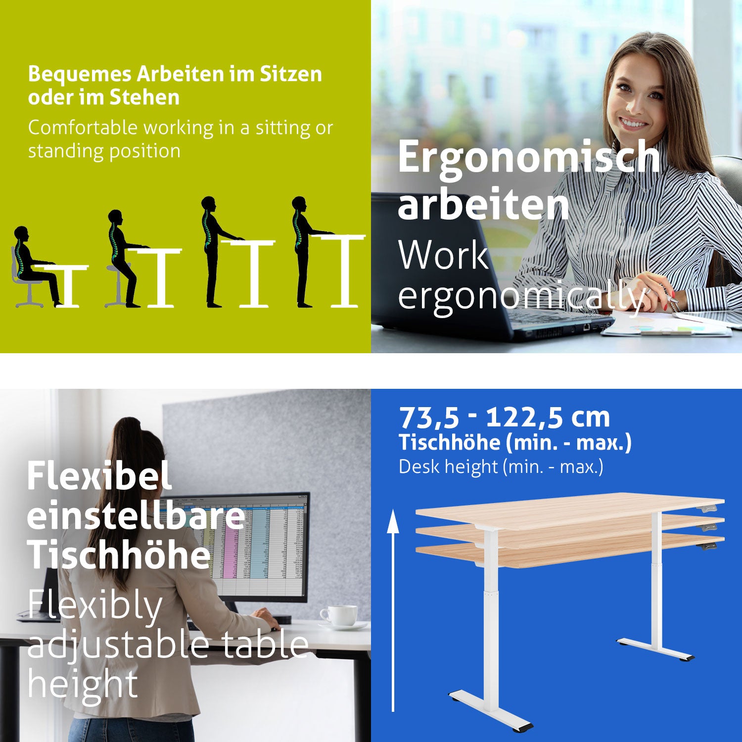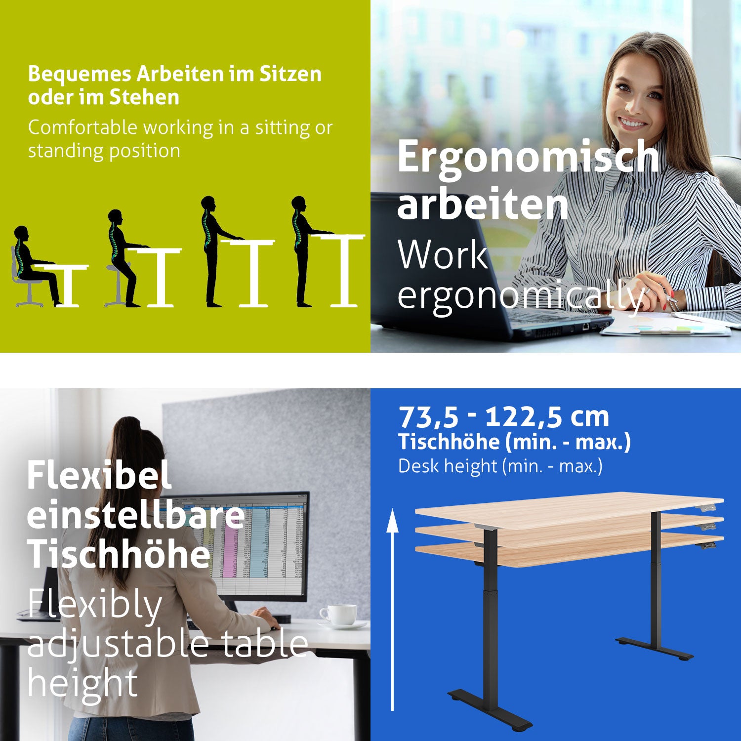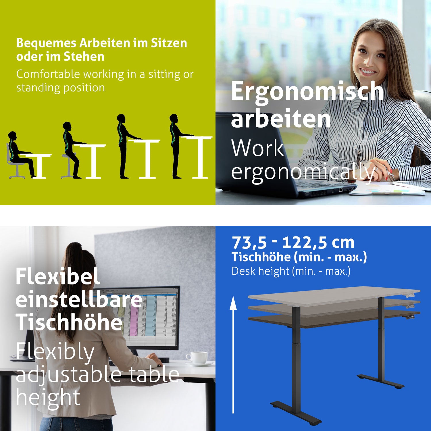 Für eine optimale Ergonomie am Arbeitsplatz ist es unerlässlich, die Schreibtischhöhe stufenlos anpassen zu können. Durch die Bildschirmarbeit in der richtigen Sitzposition wird Kreislauferkrankungen, Kopf- und Rückenschmerzen, sowie Konzentrationsproblemen vorgebeugt. Zudem unterstützt die regelmäßige Arbeit im Stehen Ihren Kreislauf und gewährleistet eine gleichmäßige Durchblutung des gesamten Körpers. Das belebt Körper und Geist.