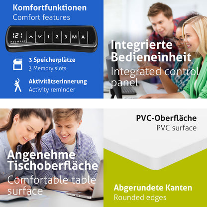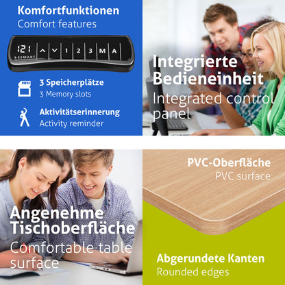 Dank des zeitlosen und eleganten Designs passt der Schreibtisch zu jedem Einrichtungsstil. Aufgrund des leisen Motors kann der Tisch auf eine beliebige Höhe von 73,5 cm bis 122,5 cm eingestellt werden und ist somit sowohl für sitzende als auch stehende Tätigkeiten empfohlen. Der Schreibtisch ist für jede Körpergröße und Altersklasse geeignet. Es lassen sich bis zu 3 verschiedene Tischhöhen abspeichern. Dank der integrierten Aktivitätserinnerung können Sie sich regelmäßig an einen Positionswechsel erinnern lassen und so Ihre Gesundheit fördern.