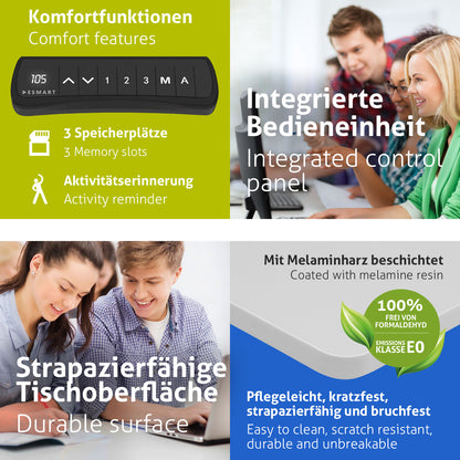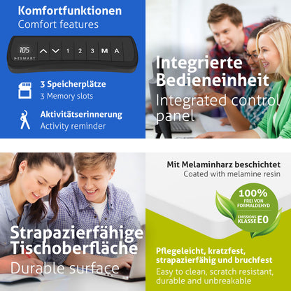 Dank des zeitlosen und eleganten Designs passt der Schreibtisch zu jedem Einrichtungsstil. Aufgrund des leisen Motors kann der Tisch auf eine beliebige Höhe von 78,5 cm bis 127,5 cm eingestellt werden und ist somit sowohl für sitzende als auch stehende Tätigkeiten empfohlen. Der Schreibtisch ist für jede Körpergröße und Altersklasse geeignet. Es lassen sich bis zu 3 verschiedene Tischhöhen abspeichern. Dank der integrierten Aktivitätserinnerung können Sie sich regelmäßig an einen Positionswechsel erinnern lassen und so Ihre Gesundheit fördern.