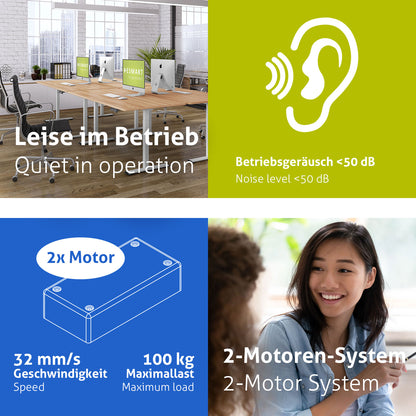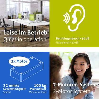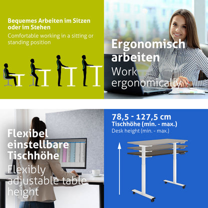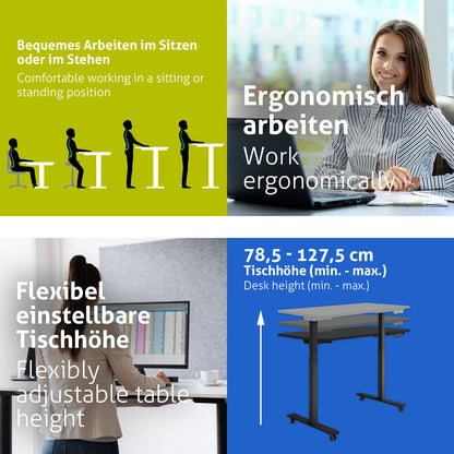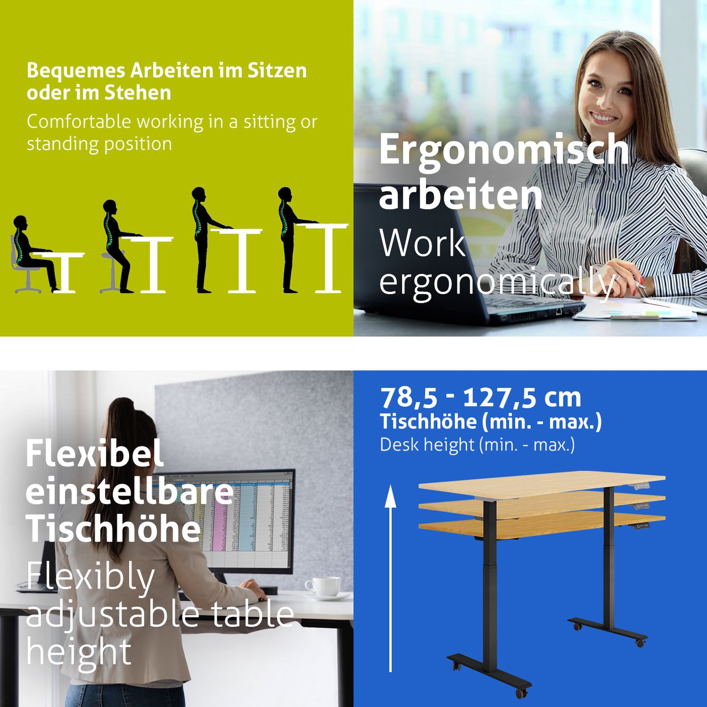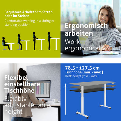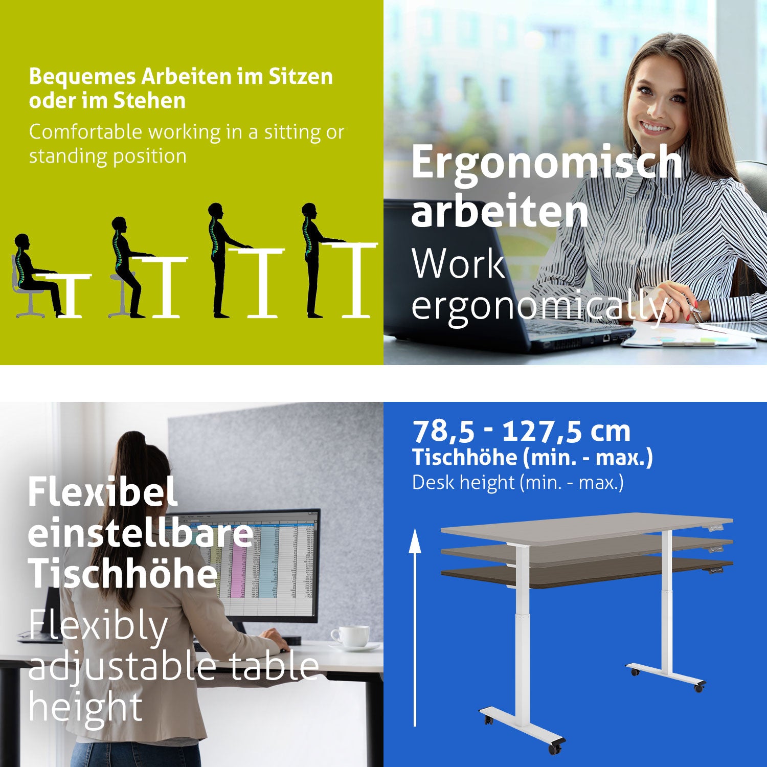 Für eine optimale Ergonomie am Arbeitsplatz ist es unerlässlich, die Schreibtischhöhe stufenlos anpassen zu können. Durch die Bildschirmarbeit in der richtigen Sitzposition wird Kreislauferkrankungen, Kopf- und Rückenschmerzen, sowie Konzentrationsproblemen vorgebeugt. Zudem unterstützt die regelmäßige Arbeit im Stehen Ihren Kreislauf und gewährleistet eine gleichmäßige Durchblutung des gesamten Körpers. Das belebt Körper und Geist.