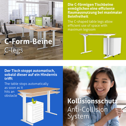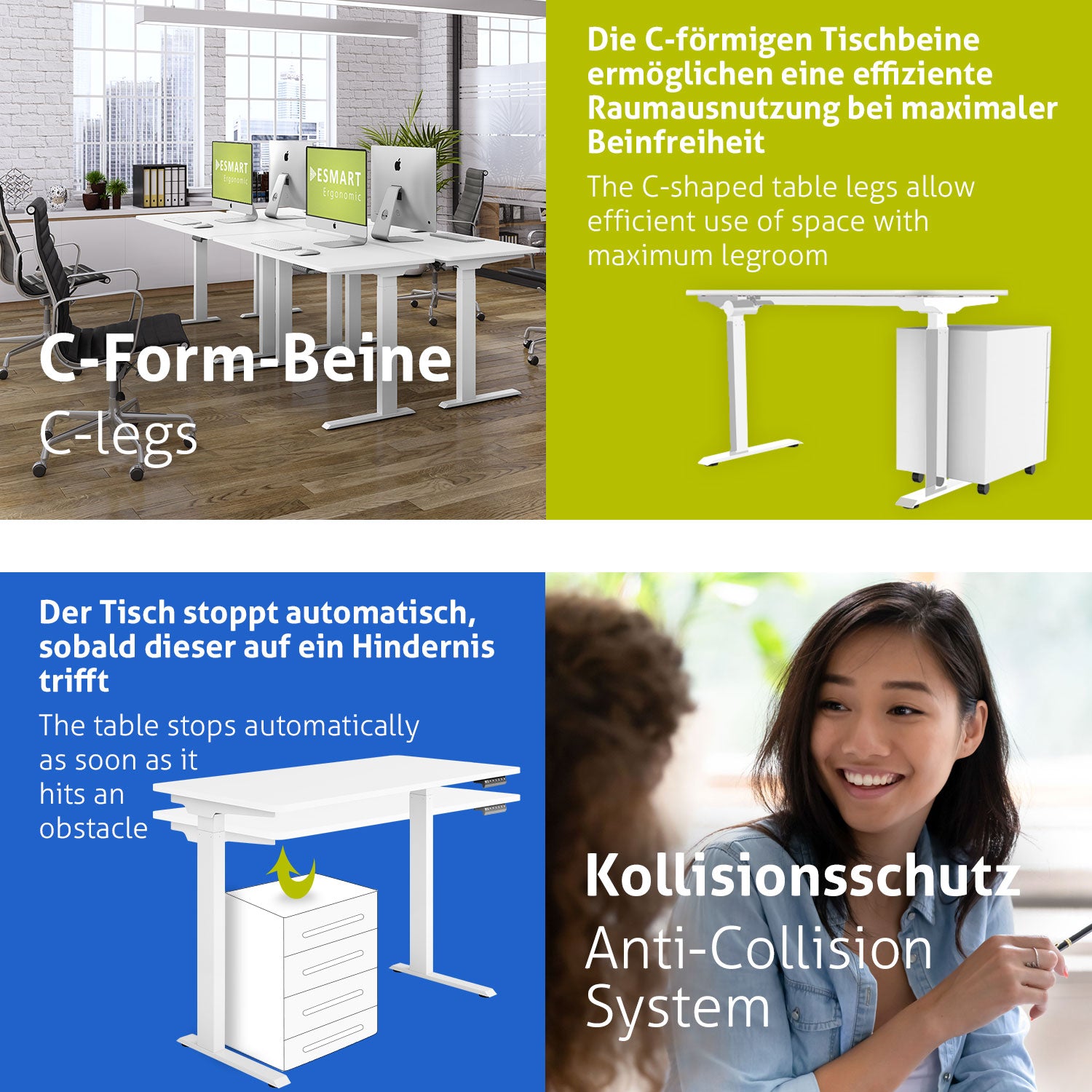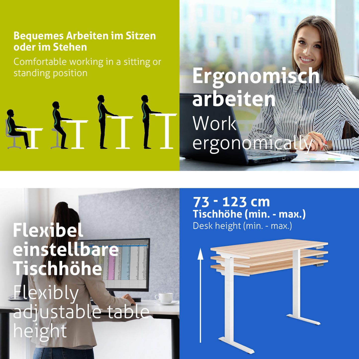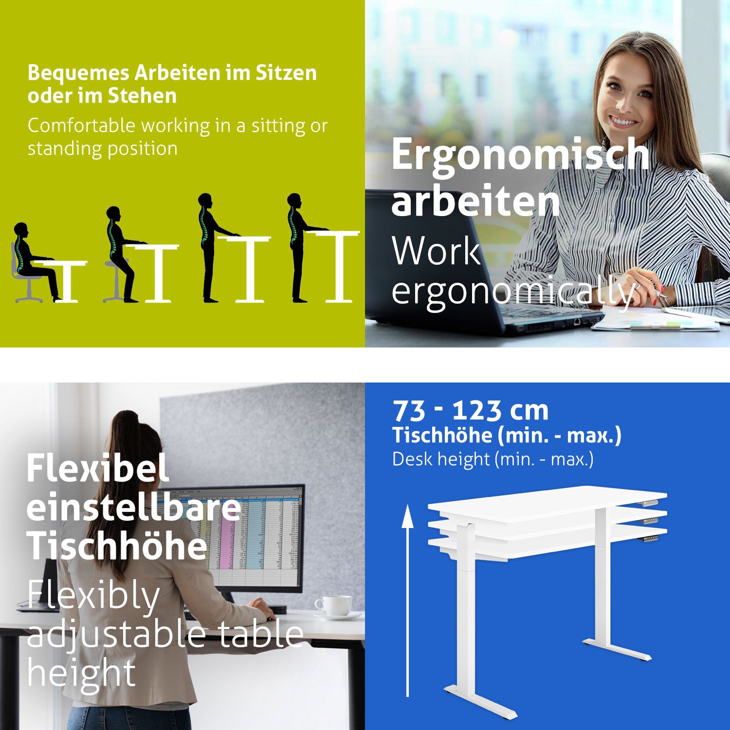 Dank des zeitlosen und eleganten Designs passt der Schreibtisch zu jedem Einrichtungsstil. Aufgrund des leisen Motors kann der Tisch auf eine beliebige Höhe von 73 cm bis 123 cm (zzgl. Tischplattenhöhe) eingestellt werden und ist somit sowohl für sitzende als auch stehende Tätigkeiten empfohlen. Der Schreibtisch ist für jede Körpergröße und Altersklasse geeignet. Es lassen sich bis zu 4 verschiedene Tischhöhen abspeichern.