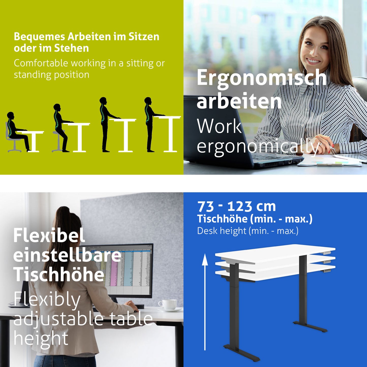Für eine optimale Ergonomie am Arbeitsplatz ist es unerlässlich, die Schreibtischhöhe stufenlos anpassen zu können. Durch die Bildschirmarbeit in der richtigen Sitzposition wird Kreislauferkrankungen, Kopf- und Rückenschmerzen, sowie Konzentrationsproblemen vorgebeugt. Zudem unterstützt die regelmäßige Arbeit im Stehen Ihren Kreislauf und gewährleistet eine gleichmäßige Durchblutung des gesamten Körpers. Das belebt Körper und Geist.