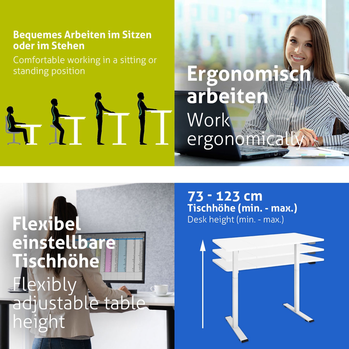 Für eine optimale Ergonomie am Arbeitsplatz ist es unerlässlich, die Schreibtischhöhe stufenlos anpassen zu können. Durch die Bildschirmarbeit in der richtigen Sitzposition wird Kreislauferkrankungen, Kopf- und Rückenschmerzen, sowie Konzentrationsproblemen vorgebeugt. Zudem unterstützt die regelmäßige Arbeit im Stehen Ihren Kreislauf und gewährleistet eine gleichmäßige Durchblutung des gesamten Körpers. Das belebt Körper und Geist.