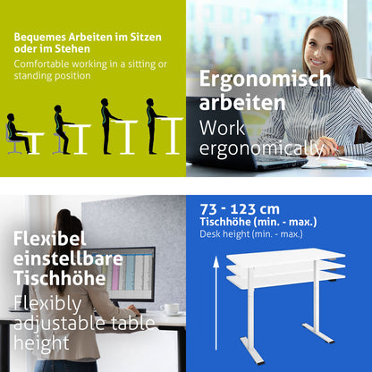 Dank des zeitlosen und eleganten Designs passt der Schreibtisch zu jedem Einrichtungsstil. Aufgrund des leisen Motors kann der Tisch auf eine beliebige Höhe von 73 cm bis 123 cm (zzgl. Tischplattenhöhe) eingestellt werden und ist somit sowohl für sitzende als auch stehende Tätigkeiten empfohlen. Der Schreibtisch ist für jede Körpergröße und Altersklasse geeignet.