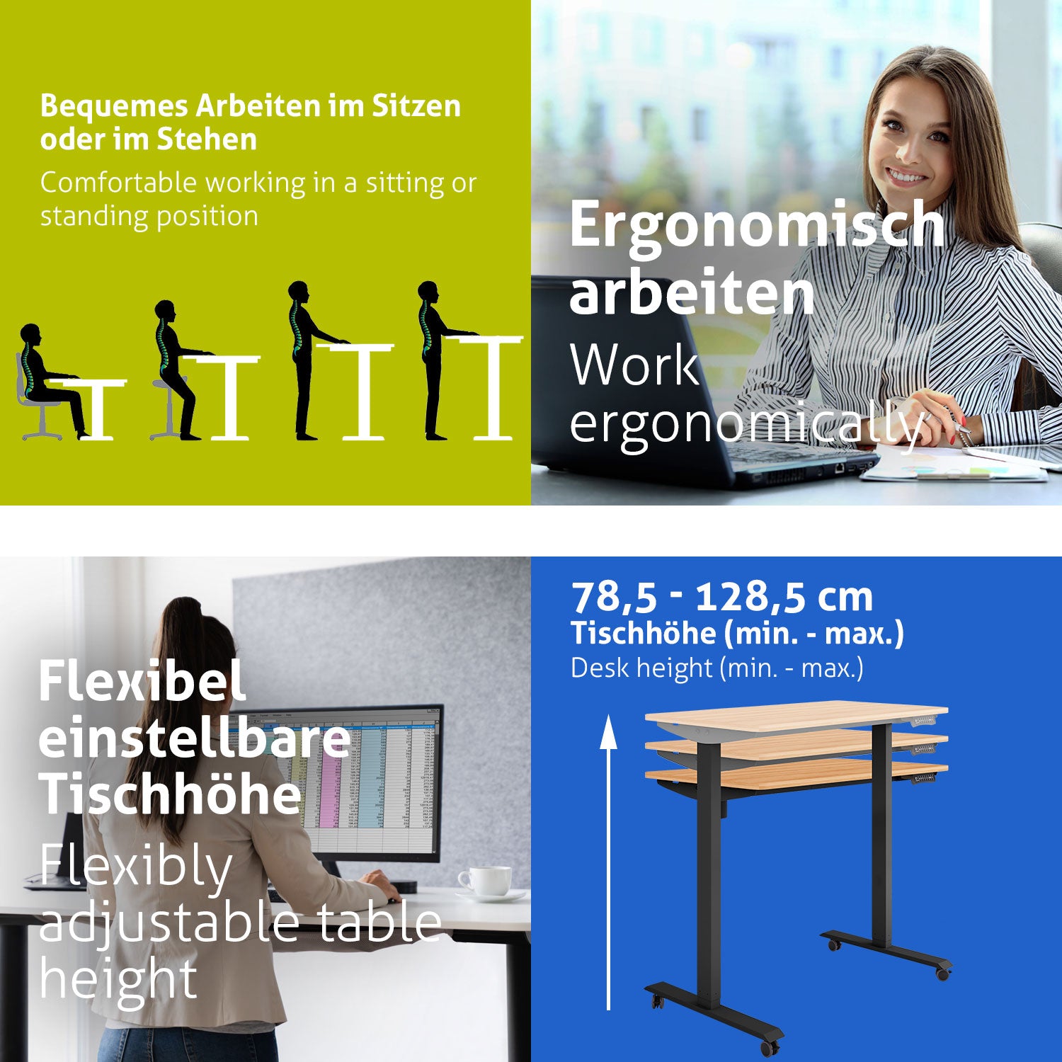 Für eine optimale Ergonomie am Arbeitsplatz ist es unerlässlich, die Schreibtischhöhe stufenlos anpassen zu können. Durch die Bildschirmarbeit in der richtigen Sitzposition wird Kreislauferkrankungen, Kopf- und Rückenschmerzen, sowie Konzentrationsproblemen vorgebeugt. Zudem unterstützt die regelmäßige Arbeit im Stehen Ihren Kreislauf und gewährleistet eine gleichmäßige Durchblutung des gesamten Körpers. Das belebt Körper und Geist.