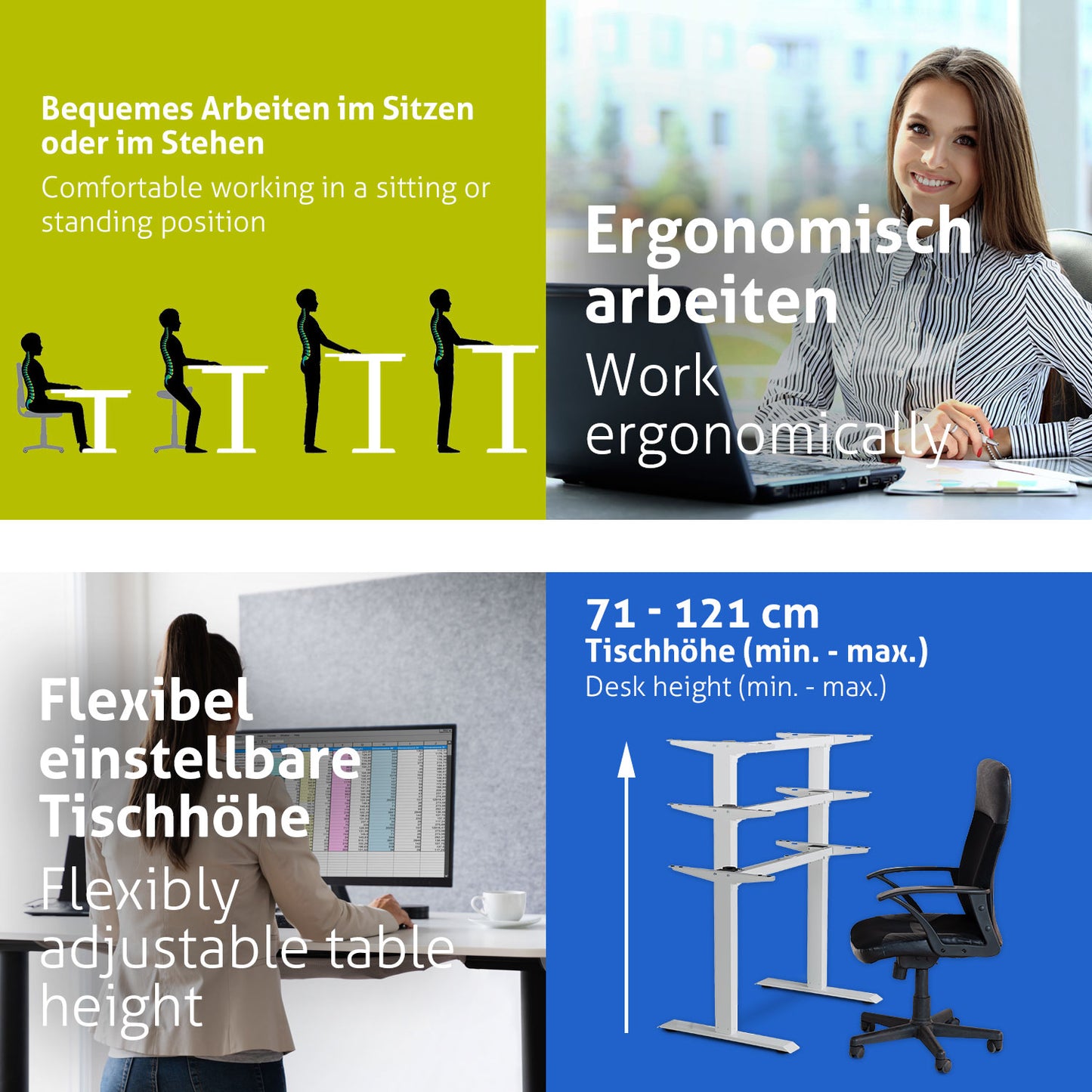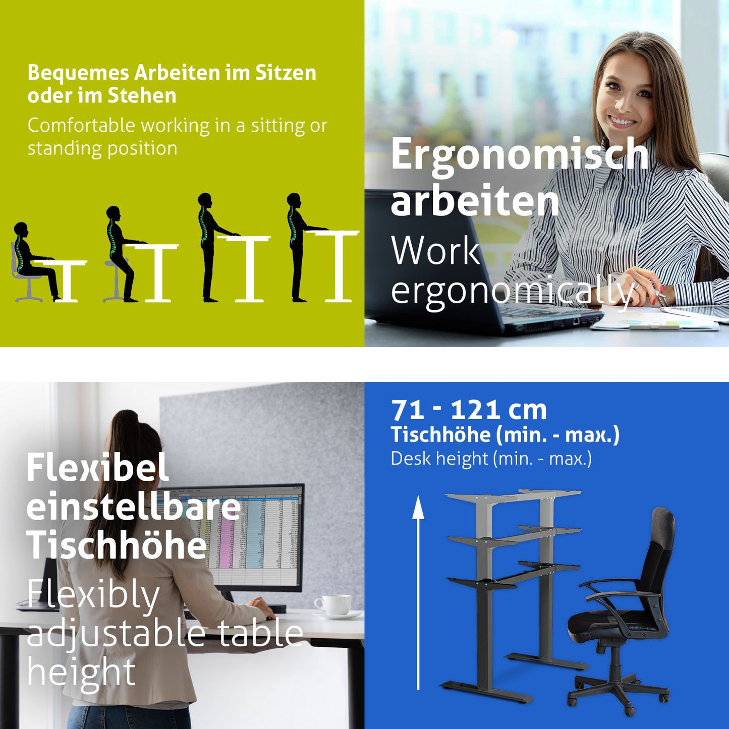 Für eine optimale Ergonomie am Arbeitsplatz ist es unerlässlich, die Schreibtischhöhe stufenlos anpassen zu können. Durch die Bildschirmarbeit in der richtigen Sitzposition wird Kreislauferkrankungen, Kopf- und Rückenschmerzen, sowie Konzentrationsproblemen vorgebeugt. Zudem unterstützt die regelmäßige Arbeit im Stehen Ihren Kreislauf und gewährleistet eine gleichmäßige Durchblutung des gesamten Körpers. Das belebt Körper und Geist.