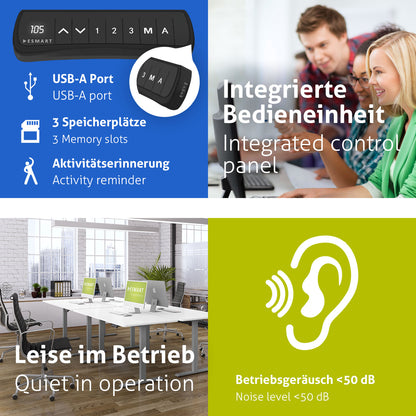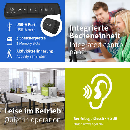 Dank des zeitlosen und eleganten Designs passt der Schreibtisch zu jedem Einrichtungsstil. Aufgrund des leisen Motors kann der Tisch auf eine beliebige Höhe von 71 cm bis 121 cm (zzgl. Tischplattenhöhe) eingestellt werden und ist somit sowohl für sitzende als auch stehende Tätigkeiten empfohlen. Der Schreibtisch ist für jede Körpergröße und Altersklasse geeignet. Es lassen sich bis zu 3 verschiedene Tischhöhen abspeichern. Dank der integrierten Aktivitätserinnerung können Sie sich regelmäßig an einen Positionswechsel erinnern lassen und so Ihre Gesundheit fördern.